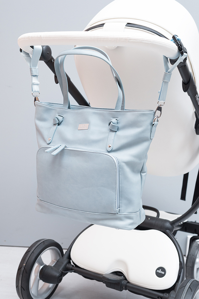 Tragen Sie die Wickeltasche an den kurzen Trägern oder nutzen Sie den langen Gurt, um die Tasche am Kinderwagen zu befestigen.