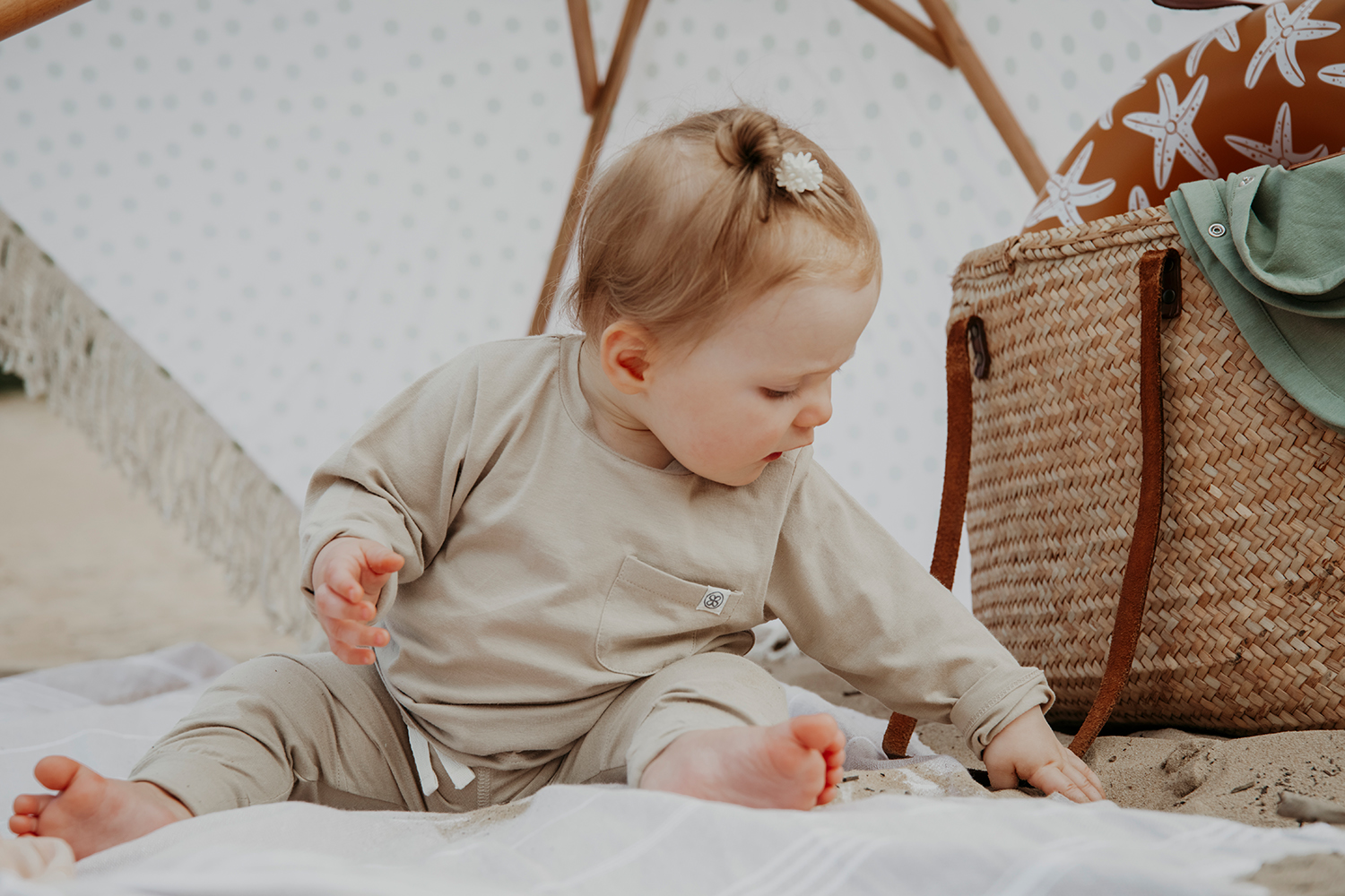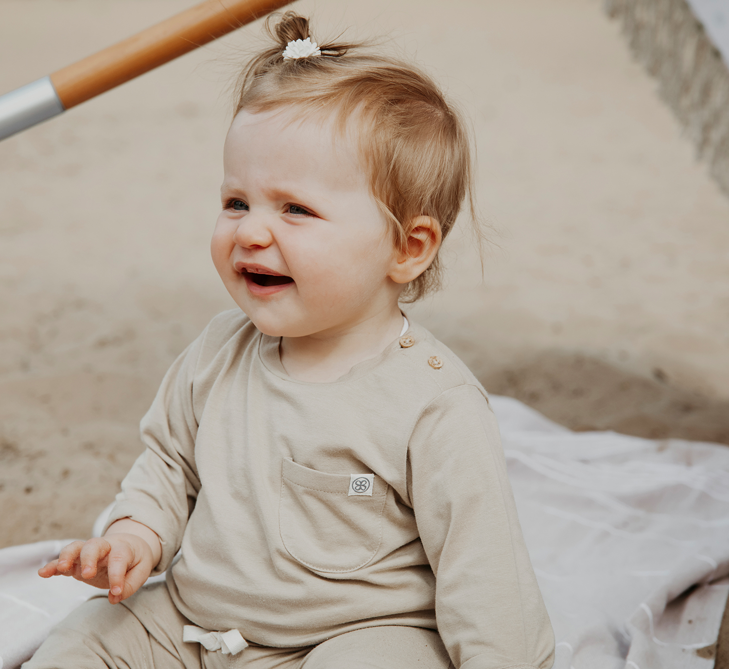Unsere UV-schützenden Jogginghosen bestehen aus unserer beliebten Stoffmischung aus Baumwolle (Bio) und Bambus, die sanft zur empfindlichen Haut Ihrer Kleinen ist.