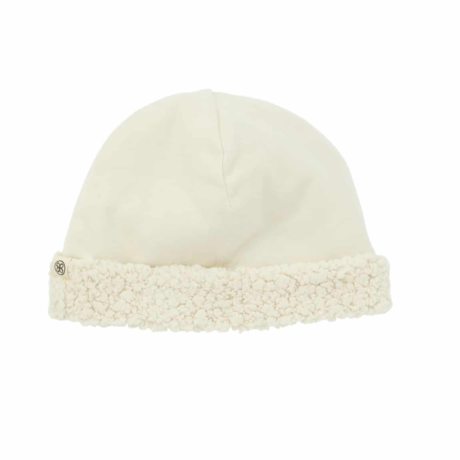 Diese niedliche Mütze besteht auf der einen Seite aus weicher Baumwolle (Bio) und auf der anderen Seite aus Polyester (recycelt) -Teddy.