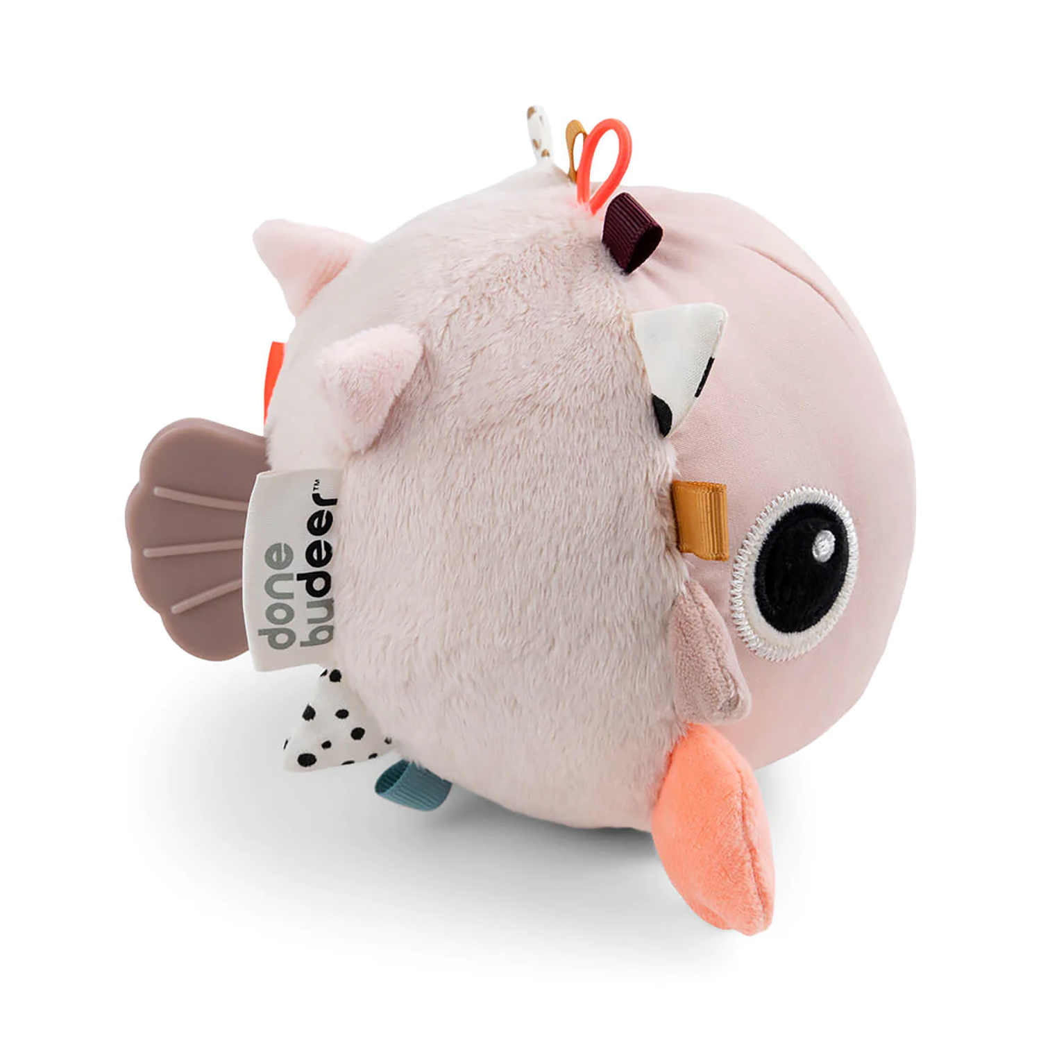Der fröhliche rosa Kugelfisch hat zahlreiche Elemente, um die Grob- und Feinmotorik zu stimulieren.