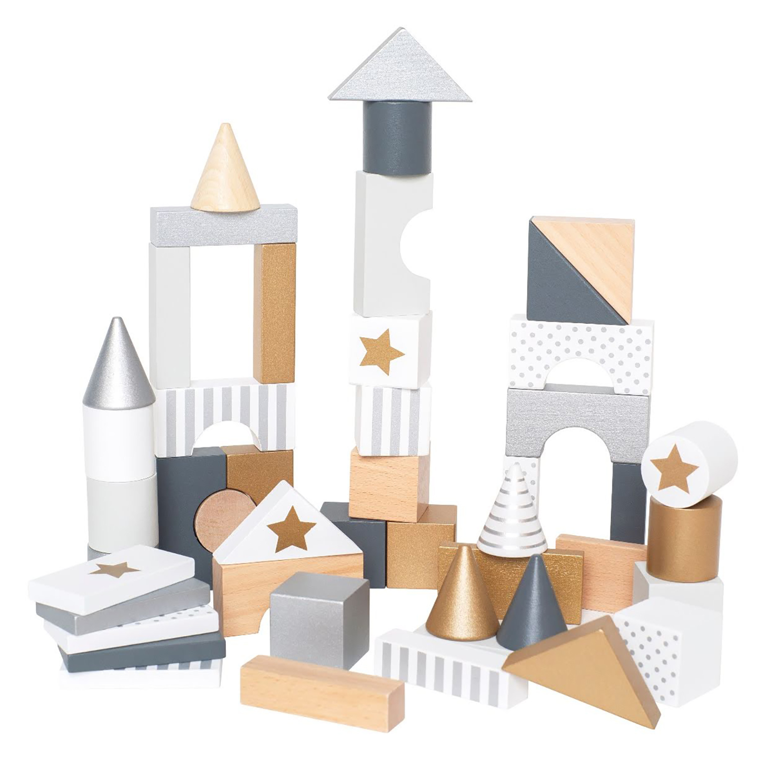 Bausteine mit 47 Holzklötzen in verschiedenen Farben und Formen.