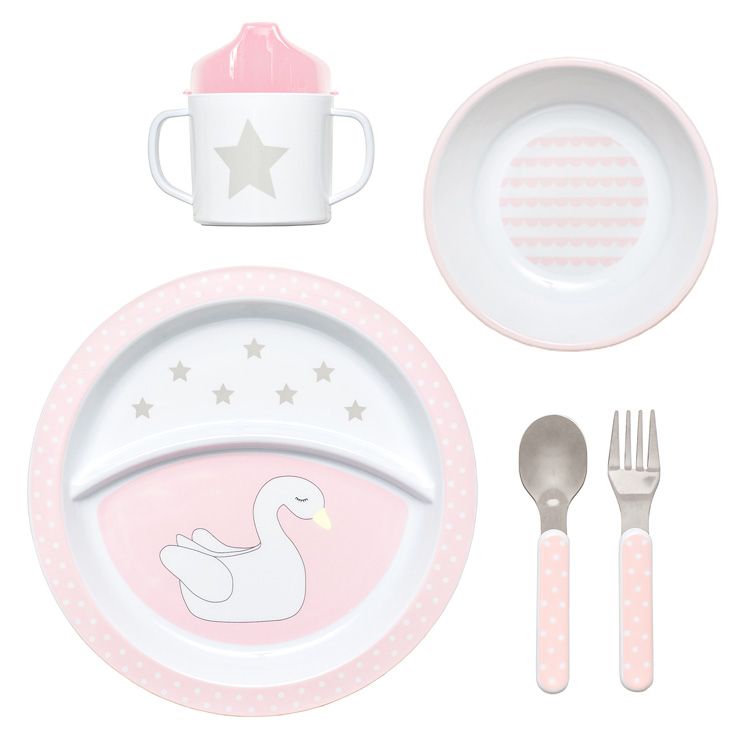 Das Set beinhaltet eine Tasse, eine Schüssel, einen Teller sowie eine Gabel und einen Löffel.