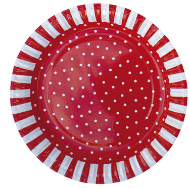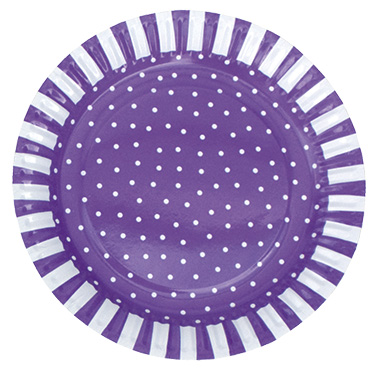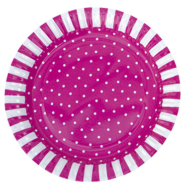 Dieses Partyteller-Set von JaBaDaBaDo ist farbenfroh gestaltet und hat weiße Punkte in der Mitte und weiße Streifen am Rand.
