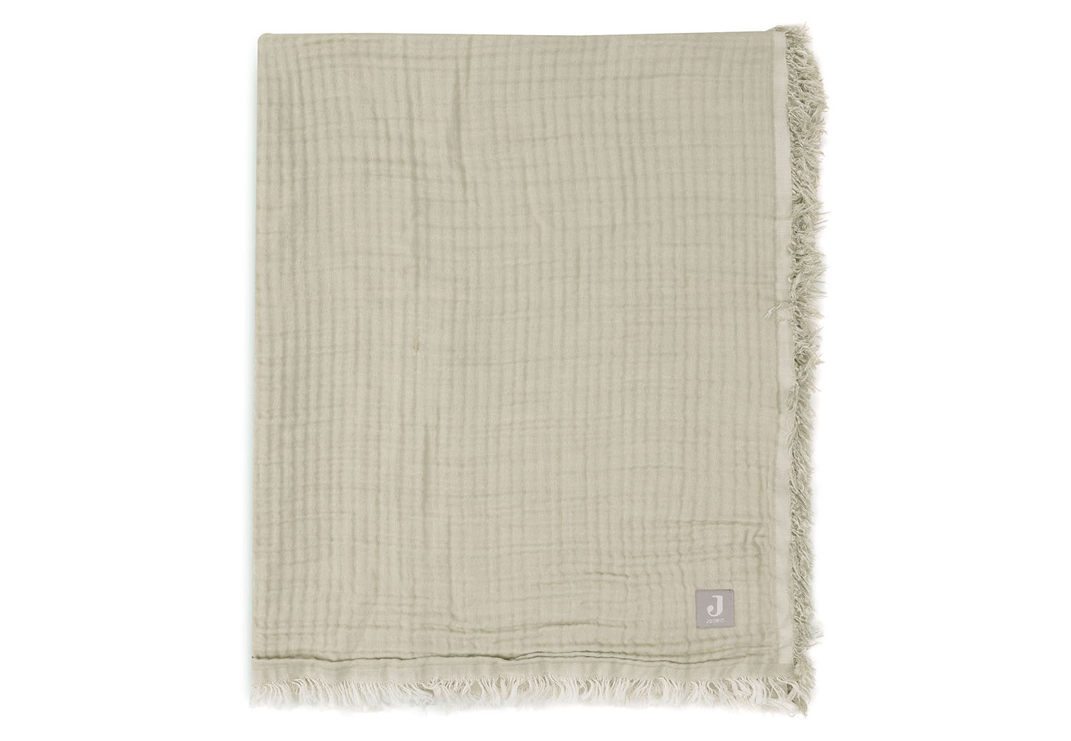 Diese Decke aus weichem Mullstoff hat schöne Fransen an der Außenseite, was für eine zusätzliche charmante Note sorgt.