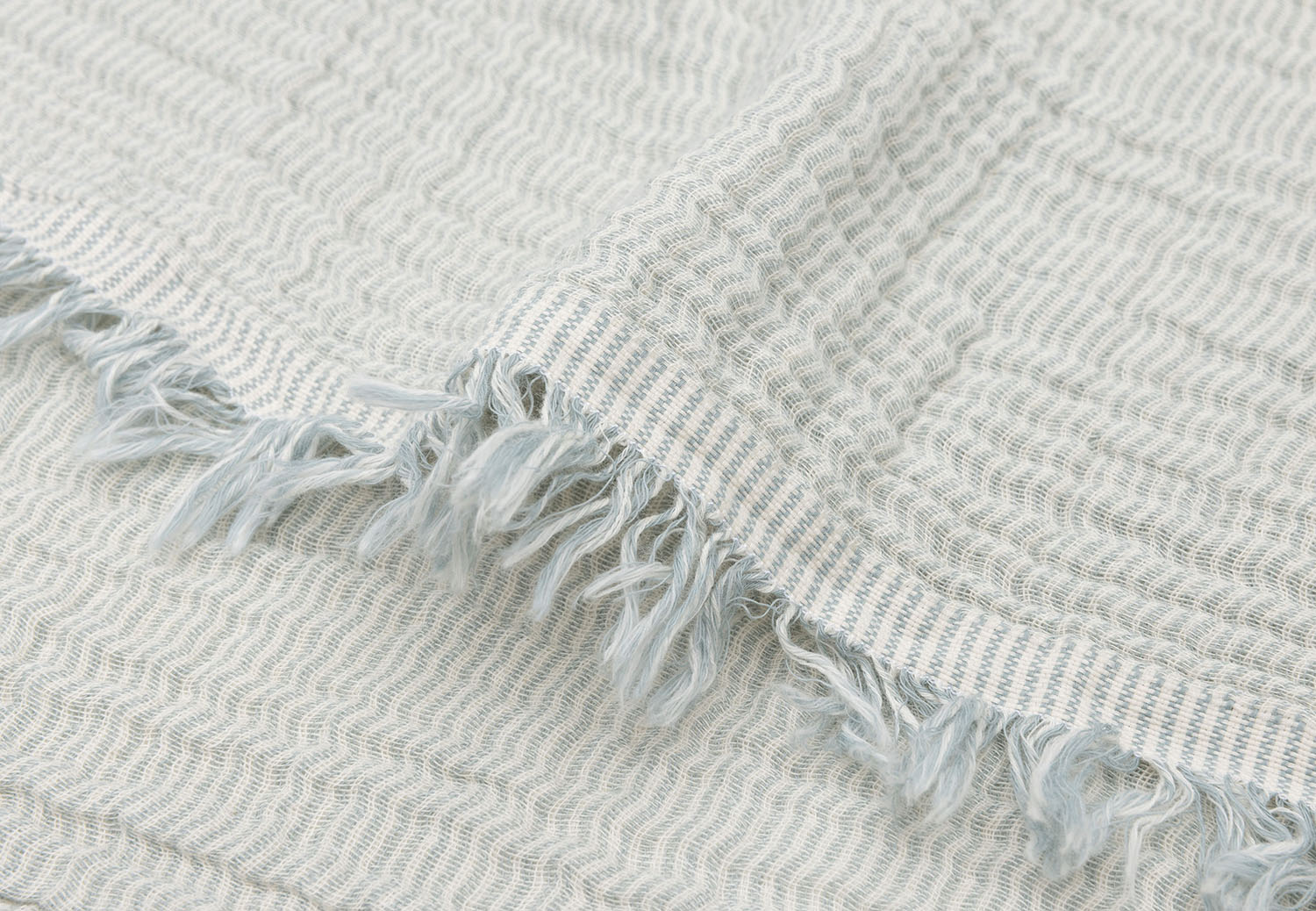 Diese superweiche und trendige Decke mit niedlichen Fransen am Rand ist in einem verspielten Streifen-Print in Biscuit und Ivory oder Sea Green und Ivory erhältlich.