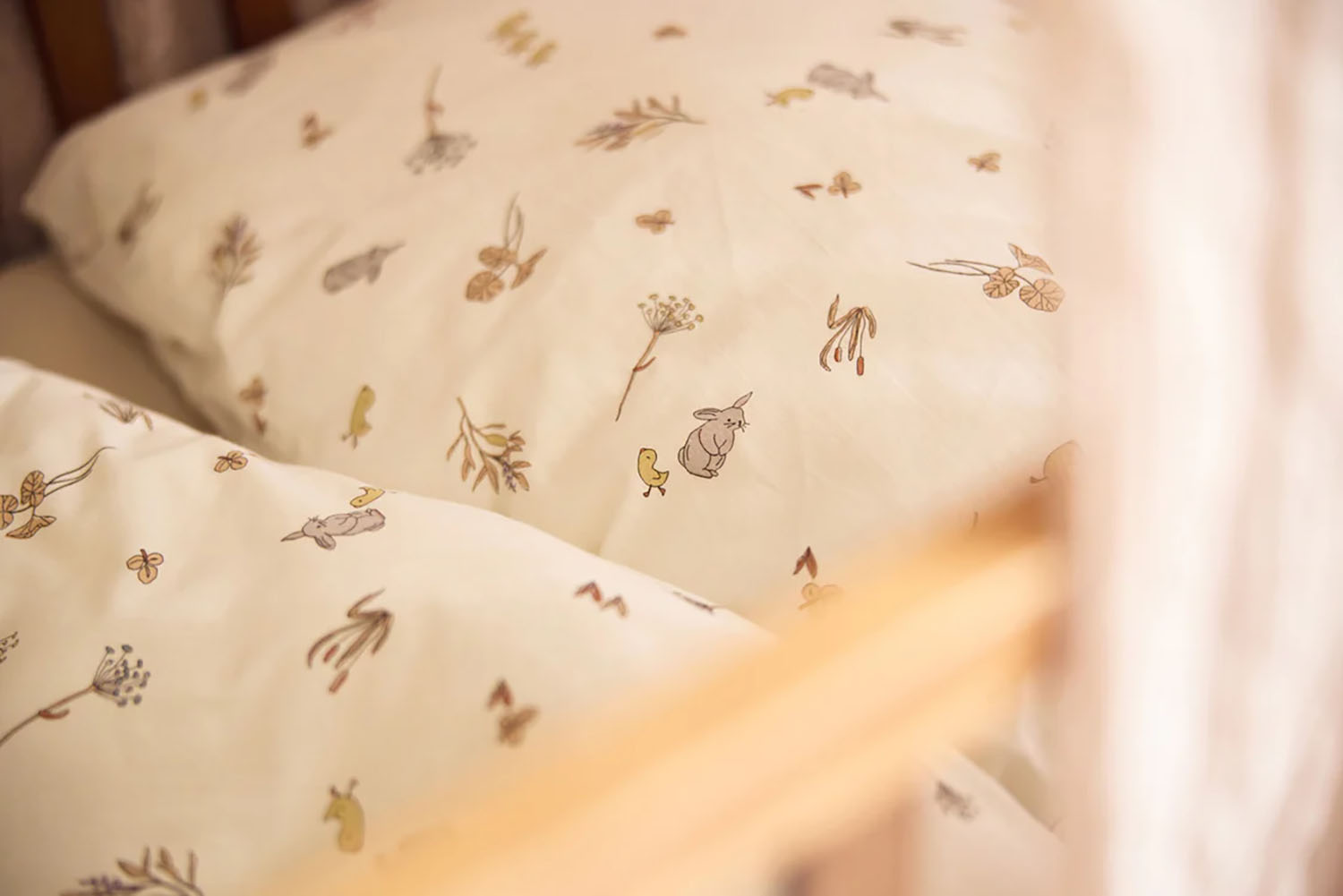 Ein dezenter Print mit unseren neutralen Farben, niedlichen Hasen, Enten und vielen Wasserpflanzen.