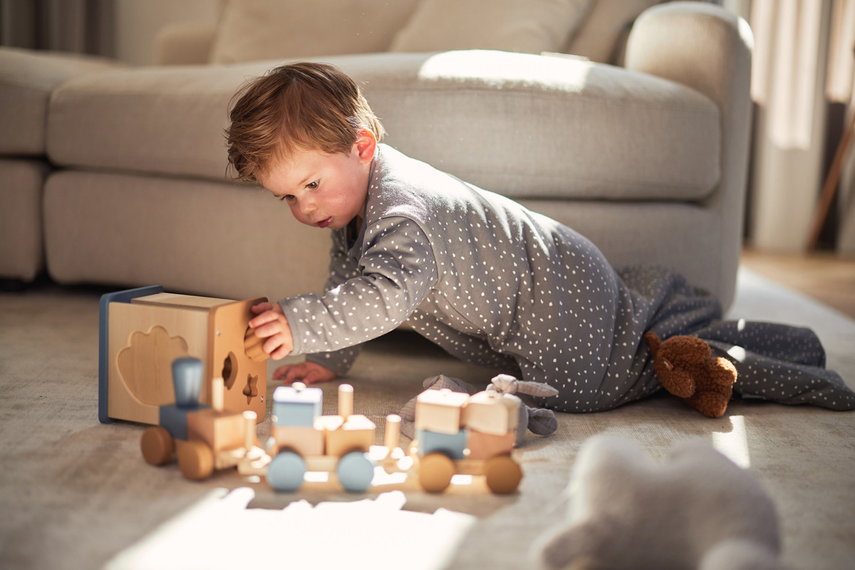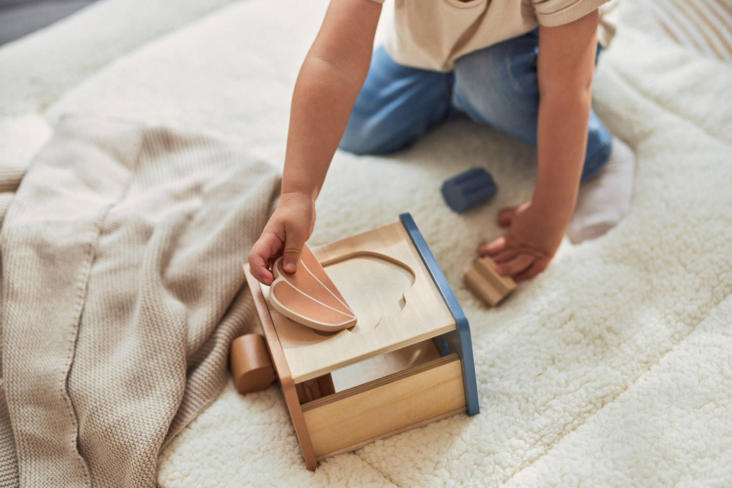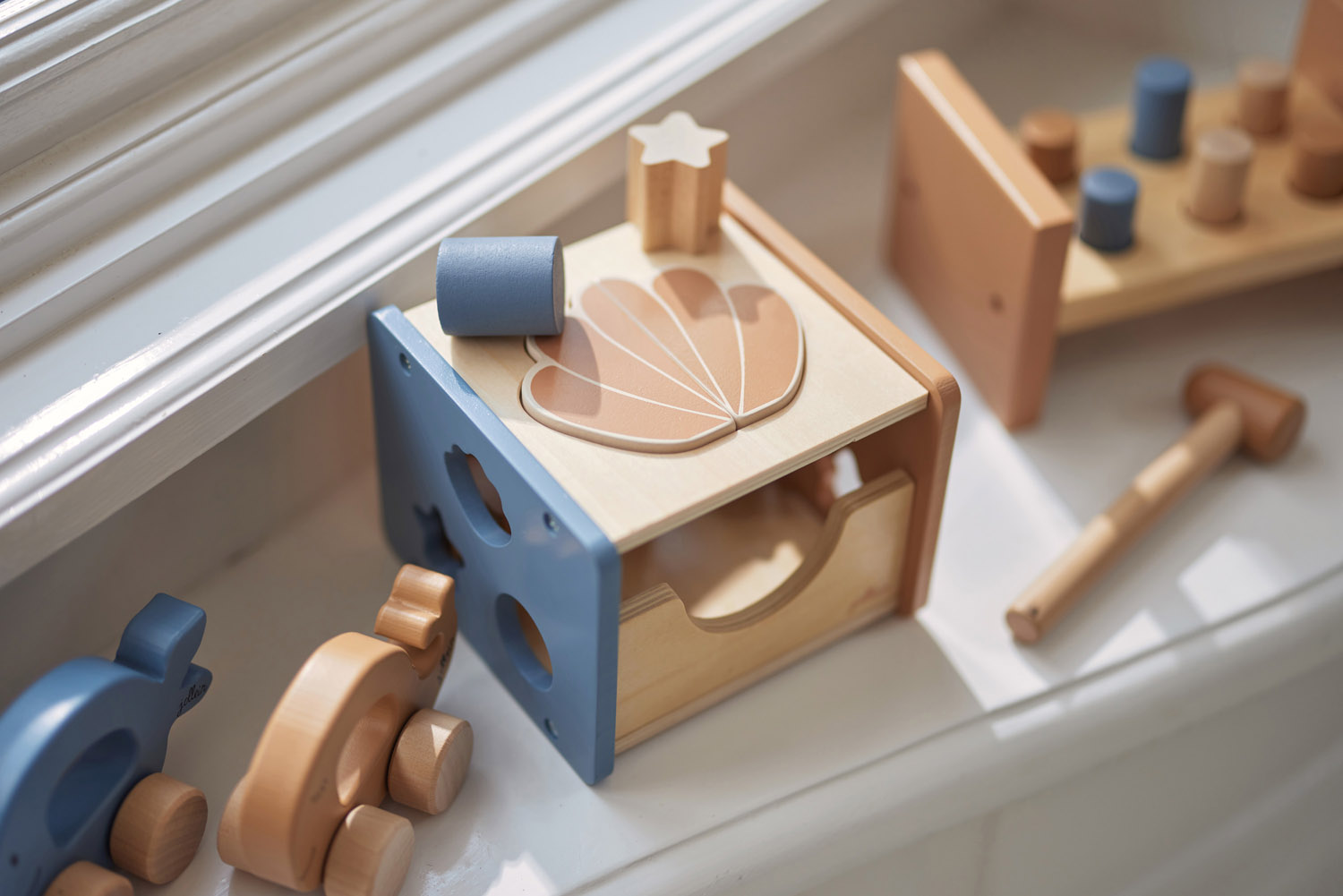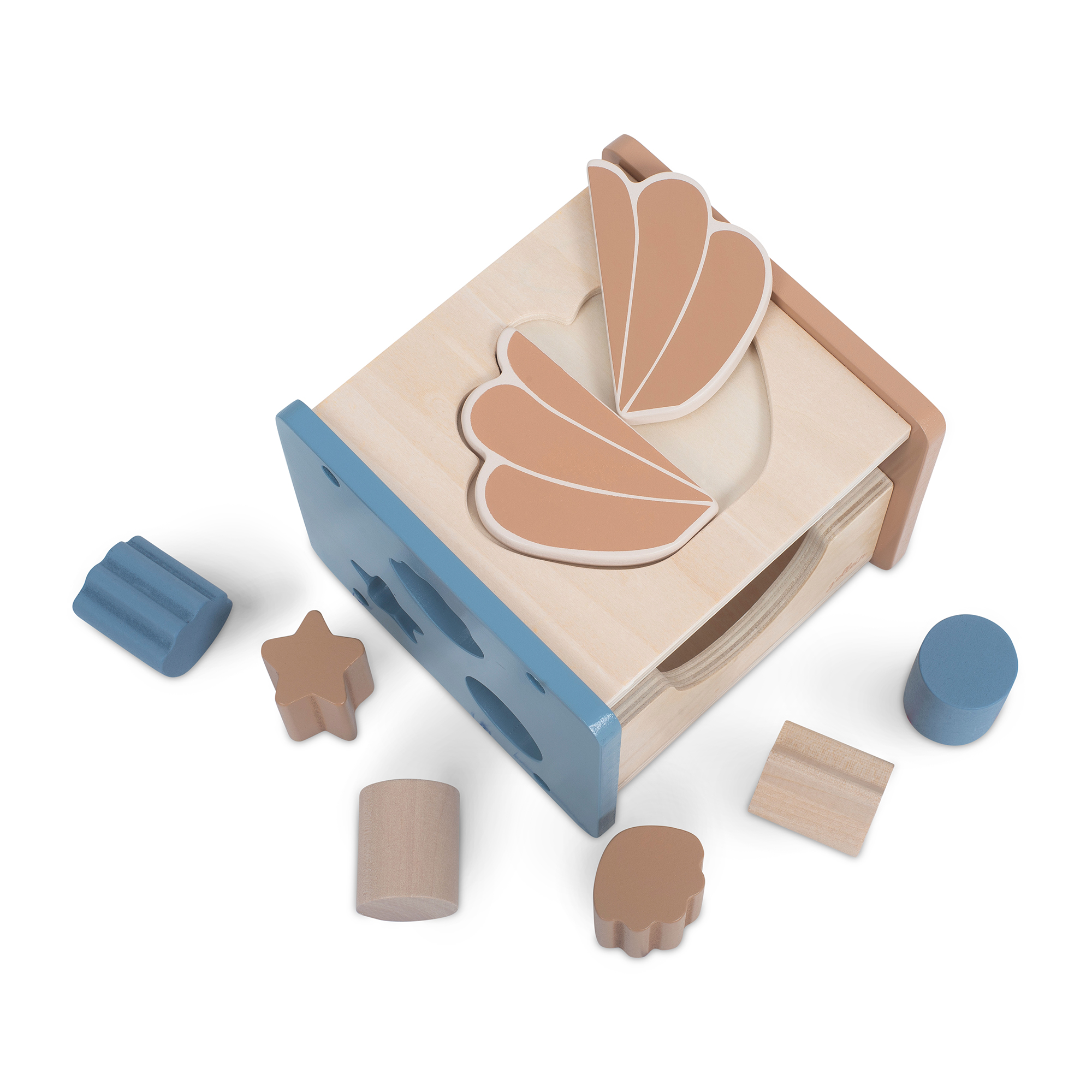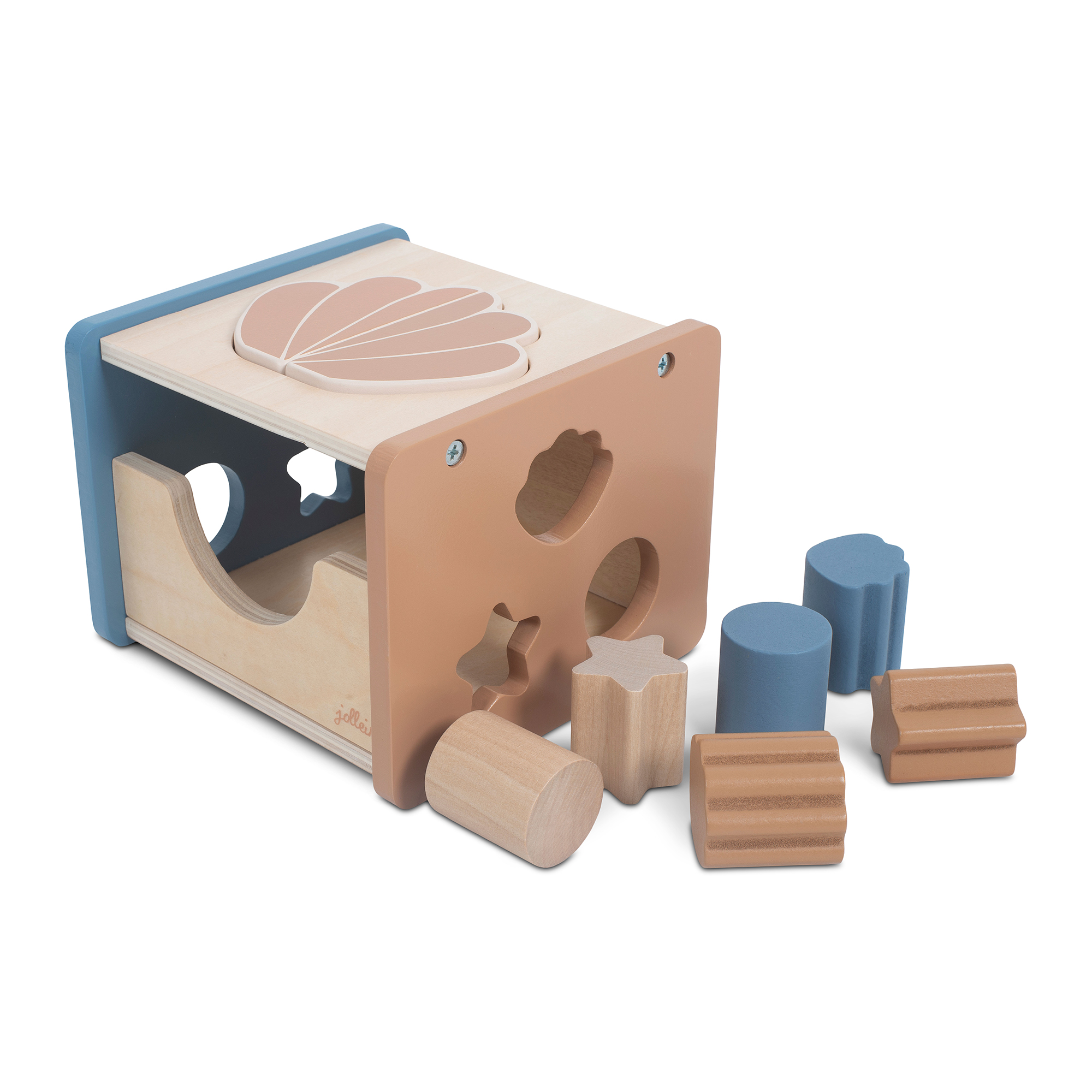 Holz Formen-Steck-Spiel mit Muschel-Motiv. Durch die verschiedenen Öffnungen im Würfel können die Formen nach innen gedrückt werden. Dieses Formen-Steck-Spiel stimuliert die Auge-Hand-Koordination und lehrt Ihr Kind Formen zu erkennen.
