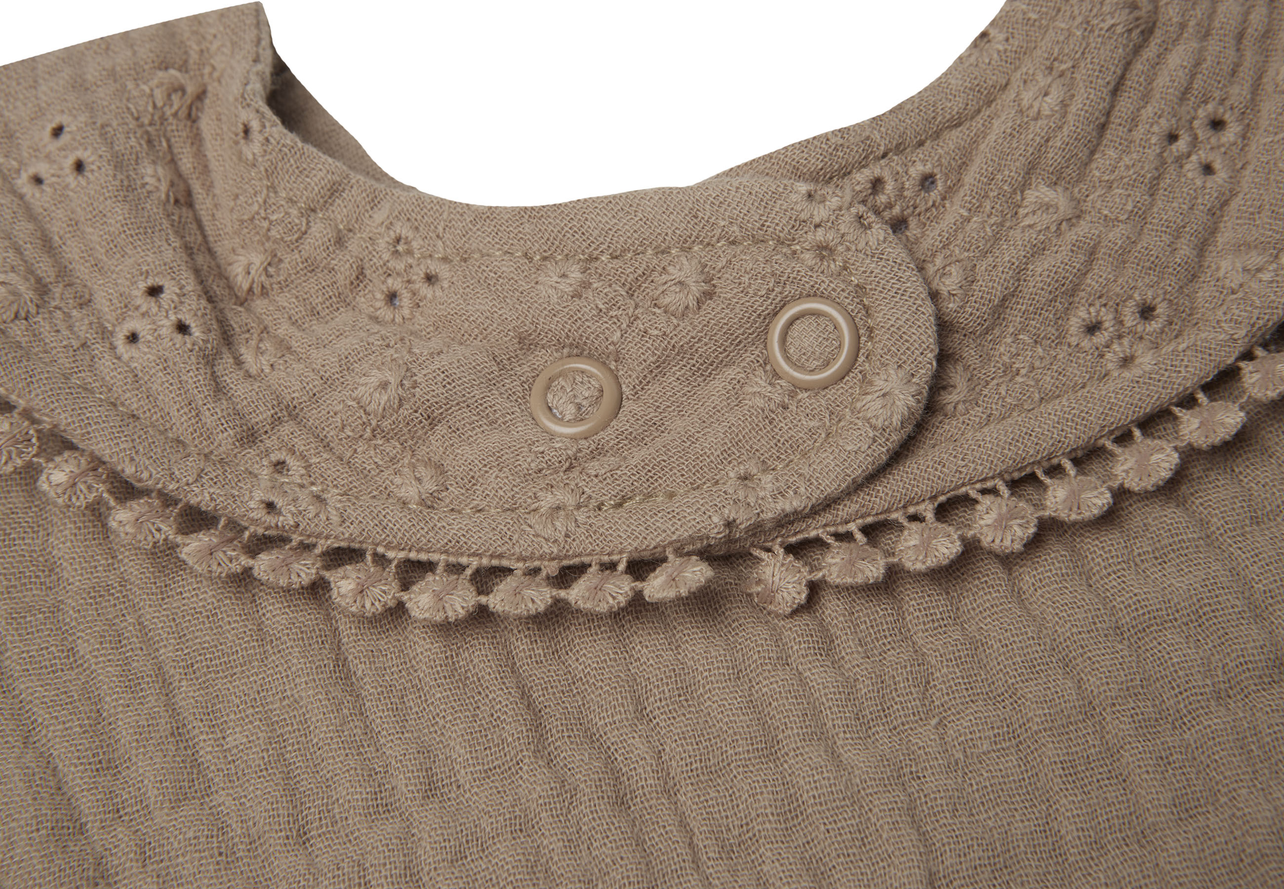 Das Lätzchen ist aus weichem Musselin-Material, das Feuchtigkeit leicht aufnimmt, und hat eine süße Stickerei auf der Vorderseite.