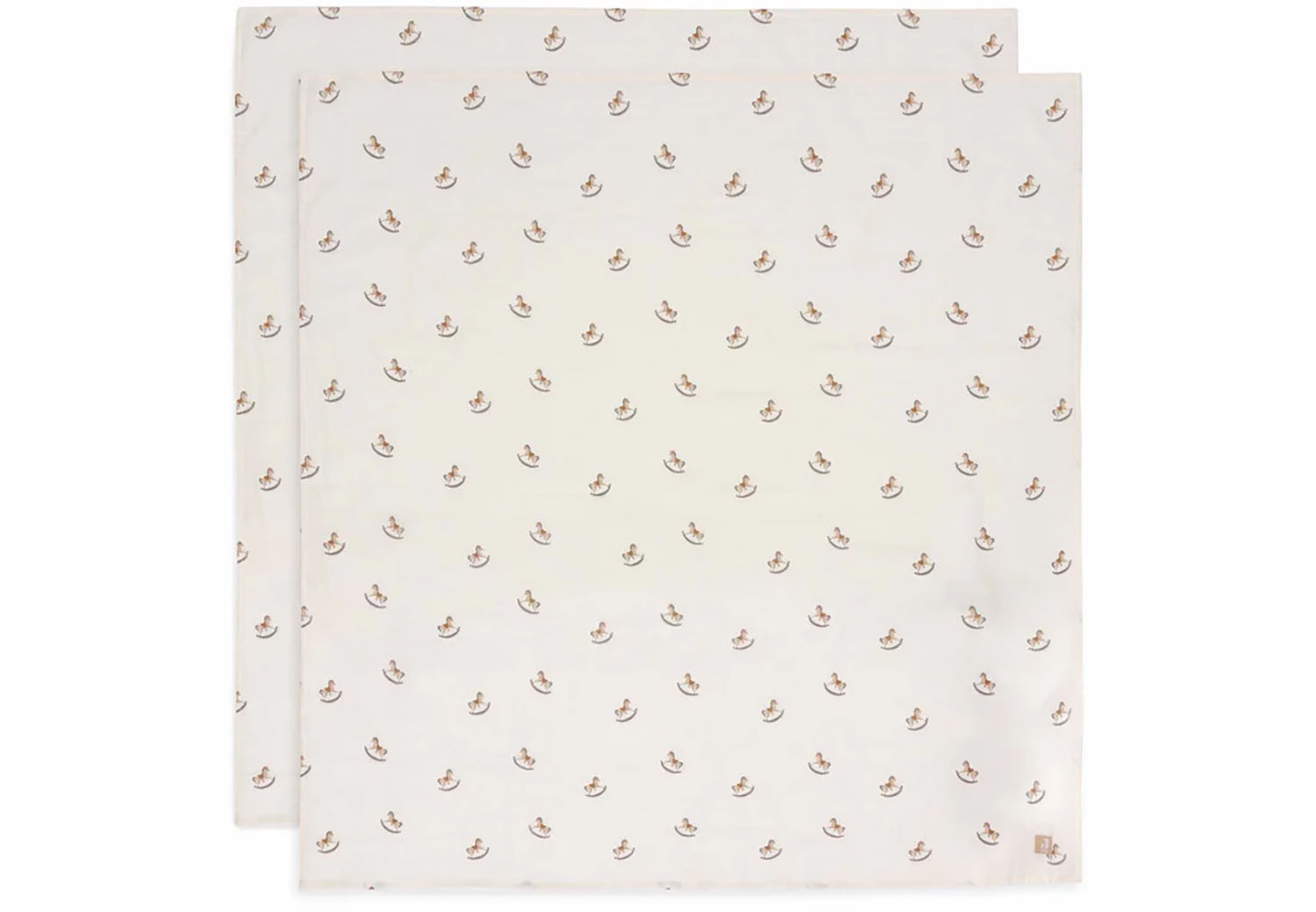 Diese Mullwindel mit Nostalgic Ride Print ist super süß und die Schaukelpferde nehmen uns mit in die Vergangenheit!