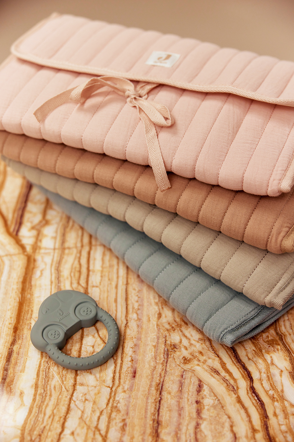 Unsere trendige Wickelunterlage aus Mullstoff ist der perfekte Begleiter unterwegs für geschäftige Eltern!