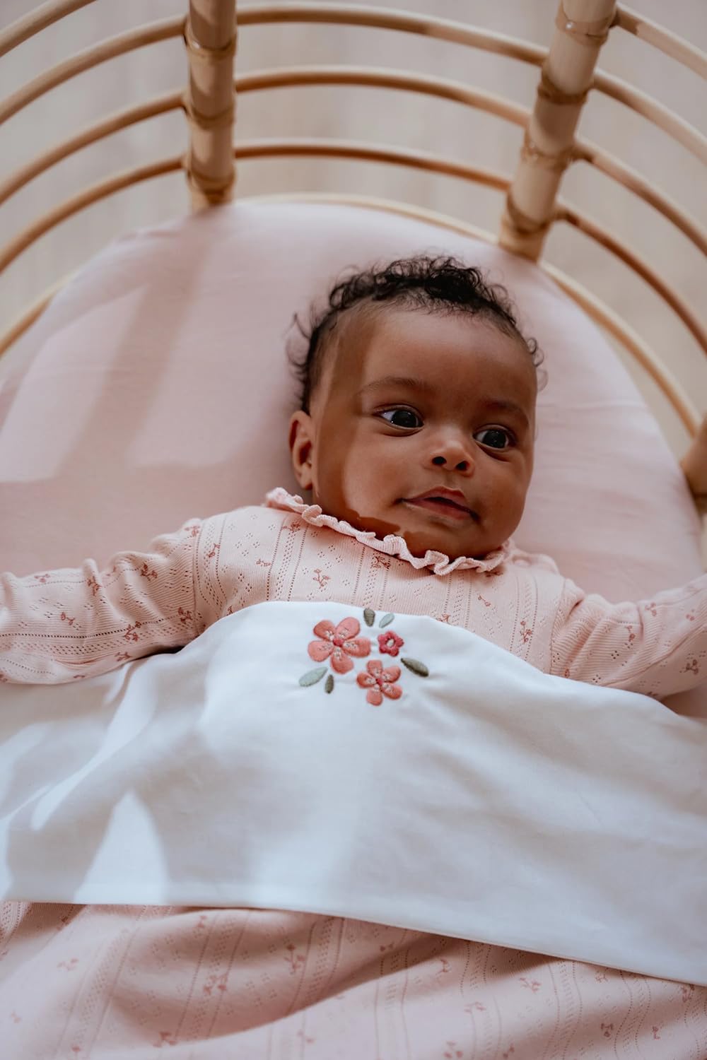 Lassen Sie Ihr Kleines unter dieser schönen und extraweichen Wiegedecke in der sanften Farbe Pure Blossom mit dezenten Blumendruck vor sich hin träumen.