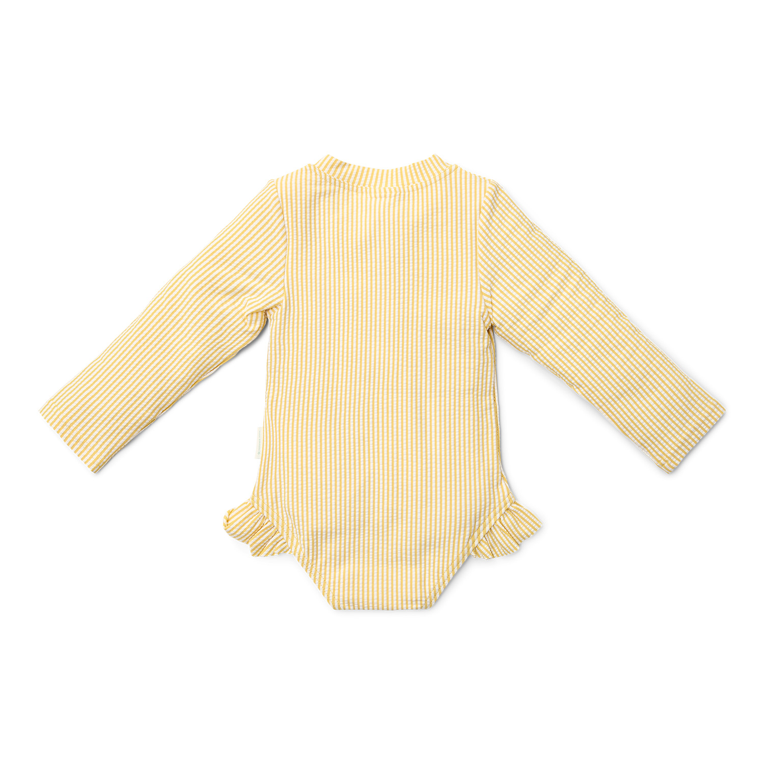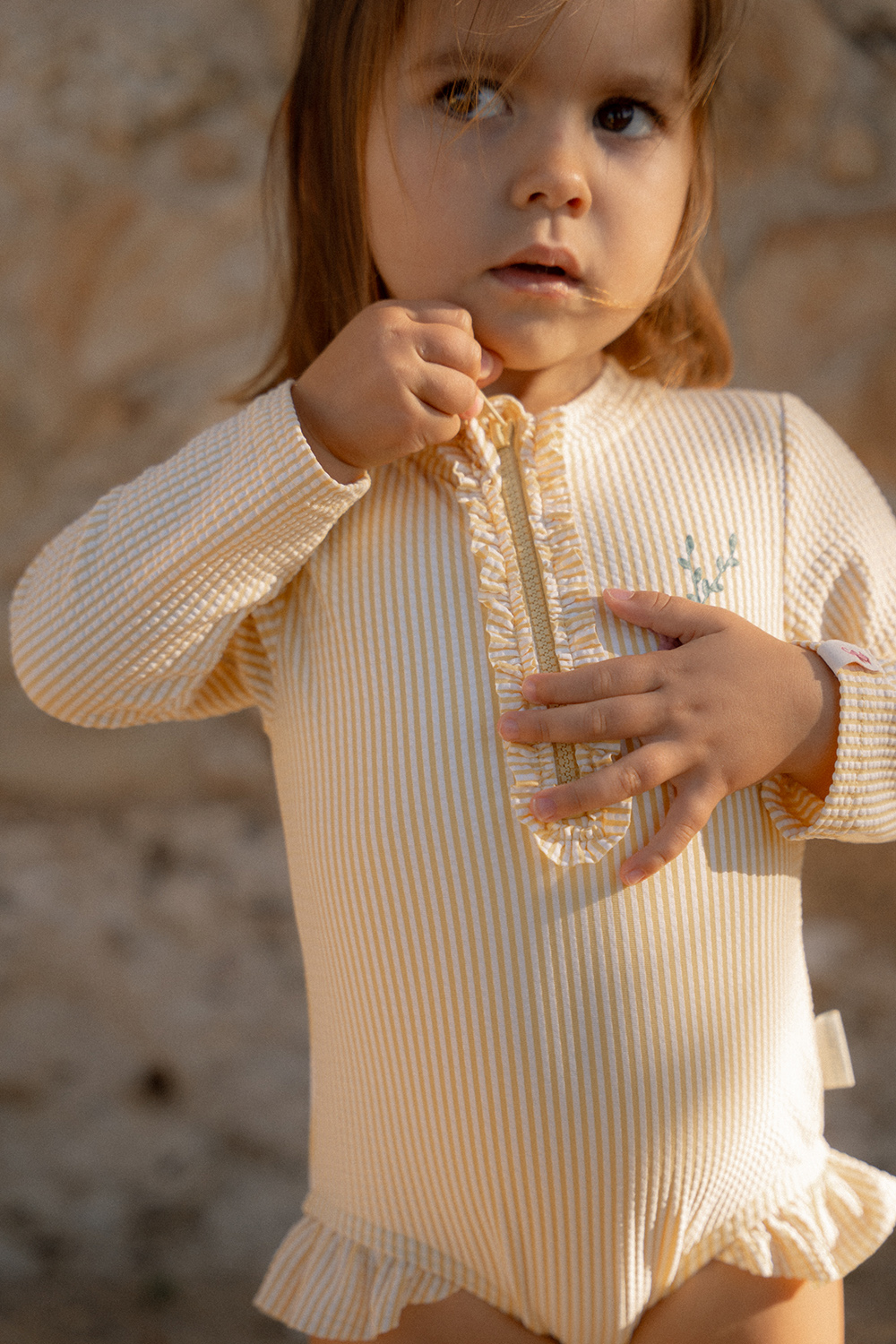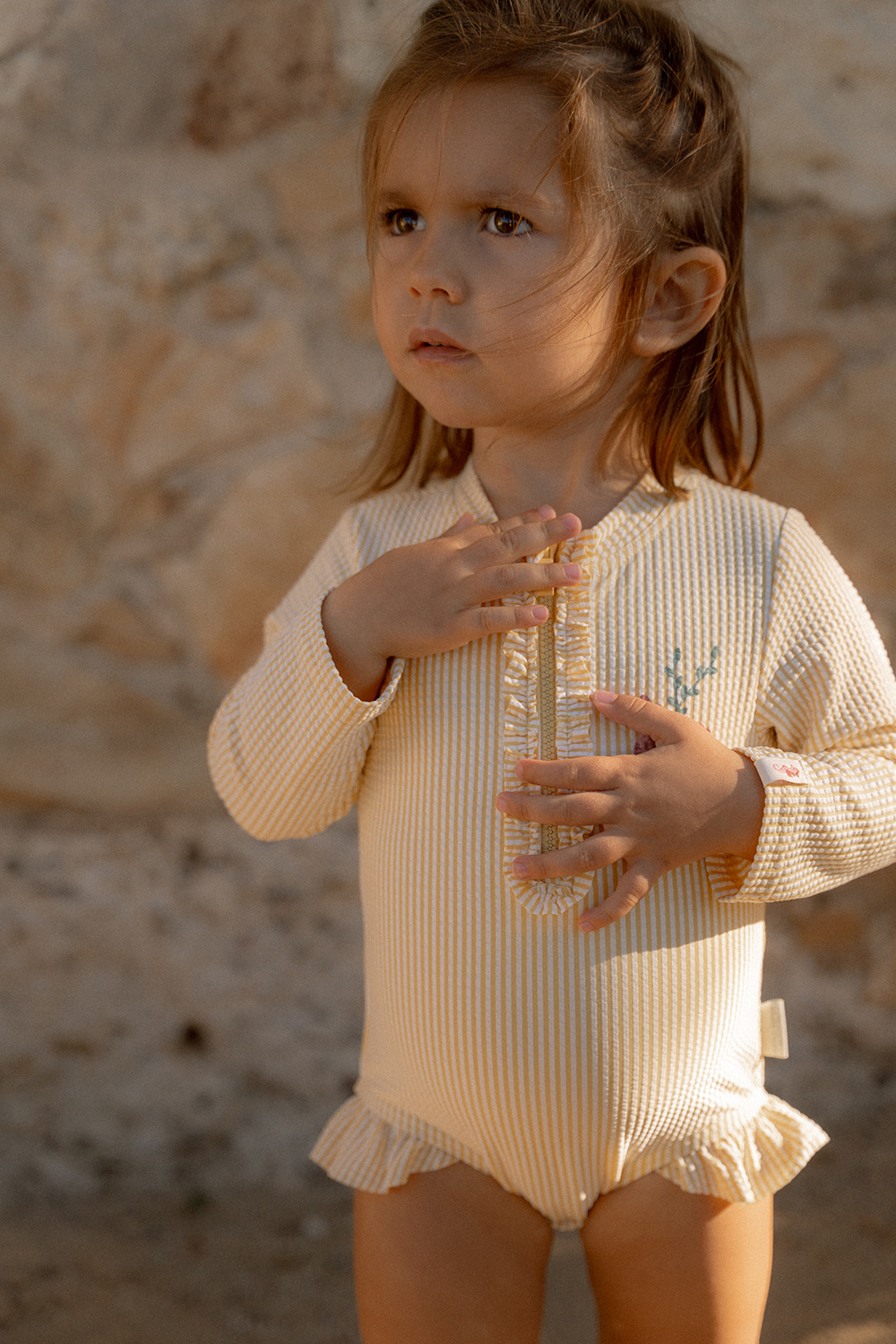 Dieser langärmelige Badeanzug präsentiert eine reizvolle Mischung aus gelben und weißen feinen Streifen, verziert mit einem niedlichen kleinen Seepferdchen-Detail.