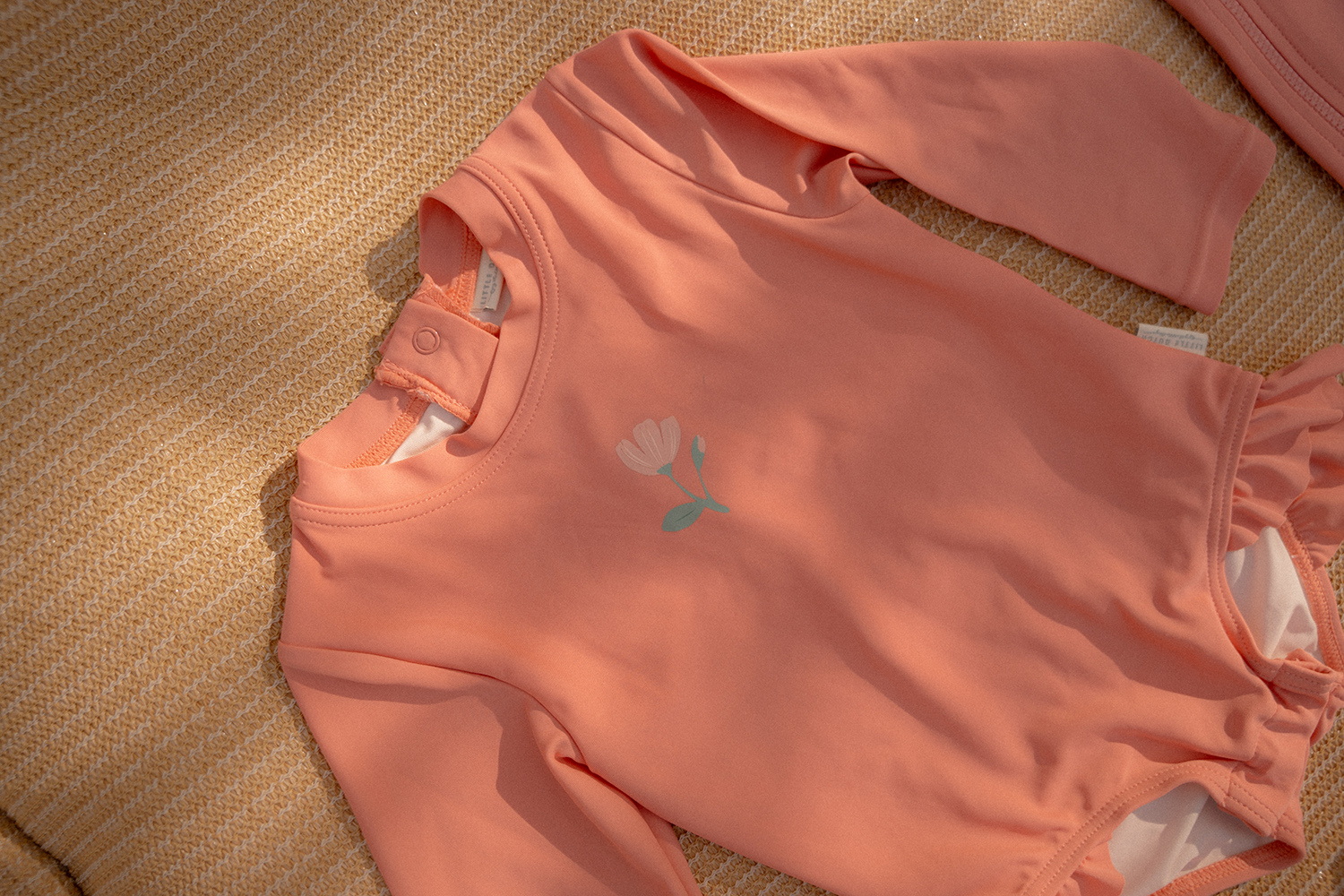 Der Badeanzug, erhältlich in vier Größen, verfügt über praktische Druckknöpfe im Schritt für einfache Windelwechsel in den beiden kleineren Größen, 62/68 und 74/80.