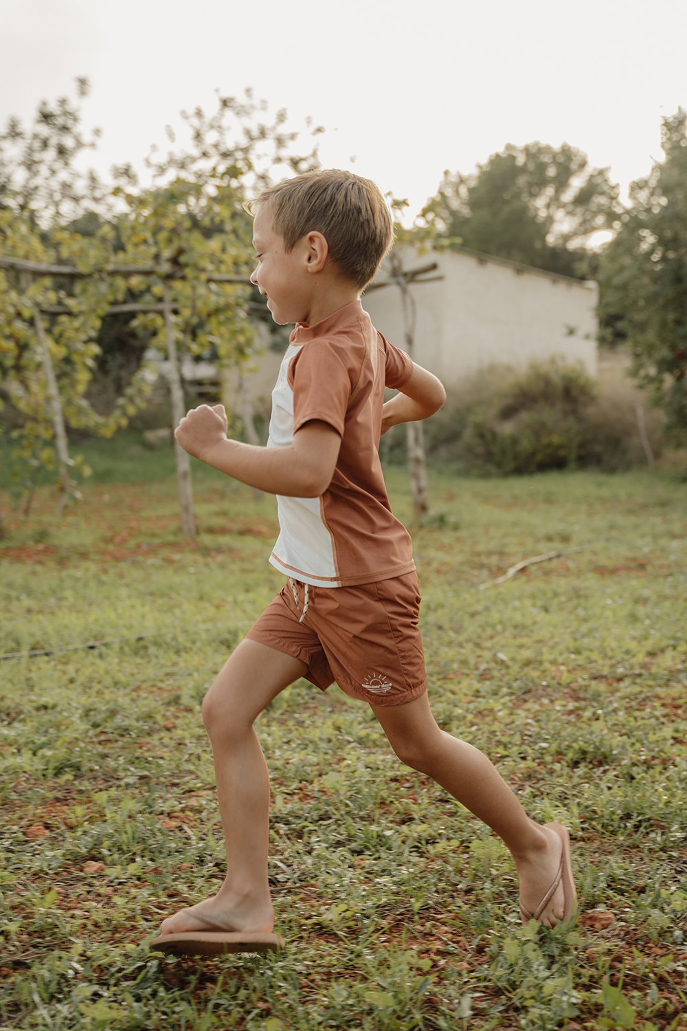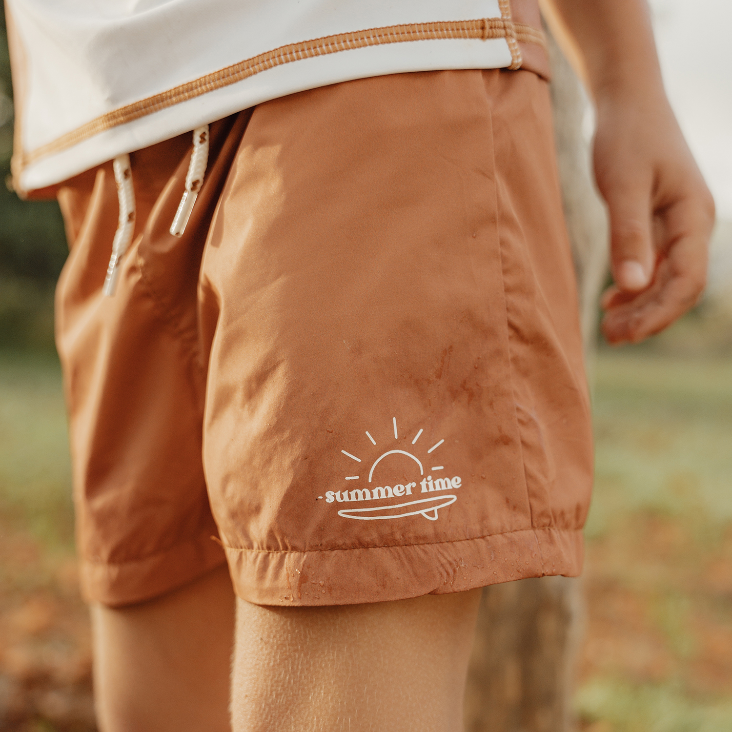 Diese Badehose aus der Kollektion Vintage Sunny Stripes ist eine Kombination aus Braun und Beige mit einem Hauch von Sonne.