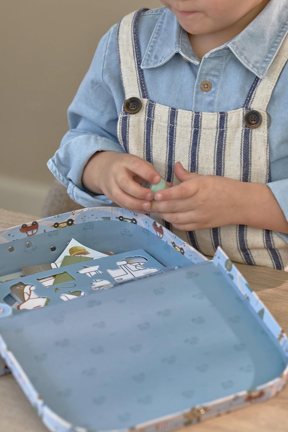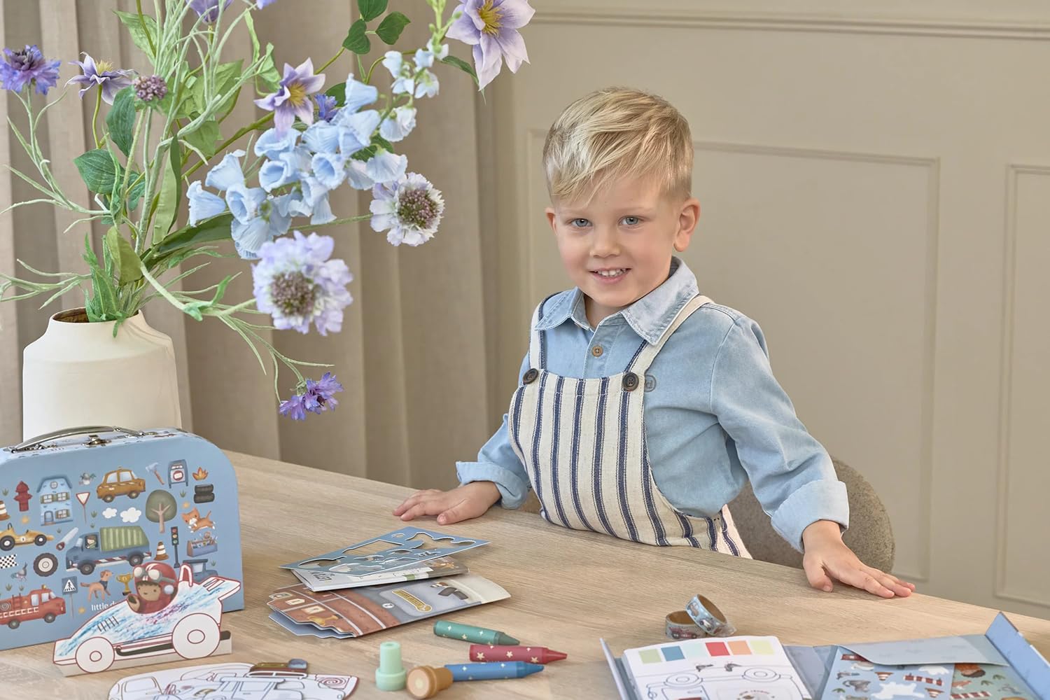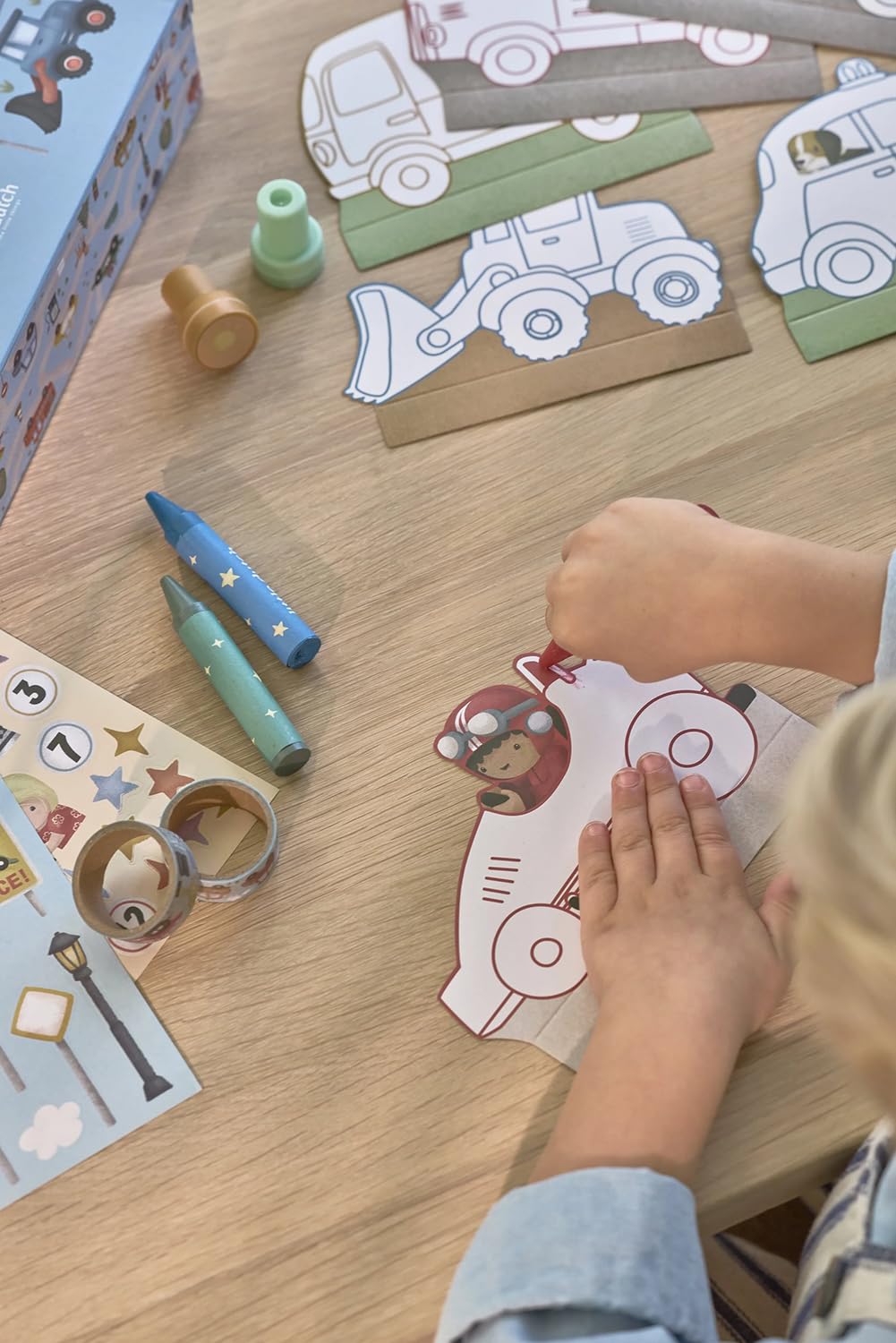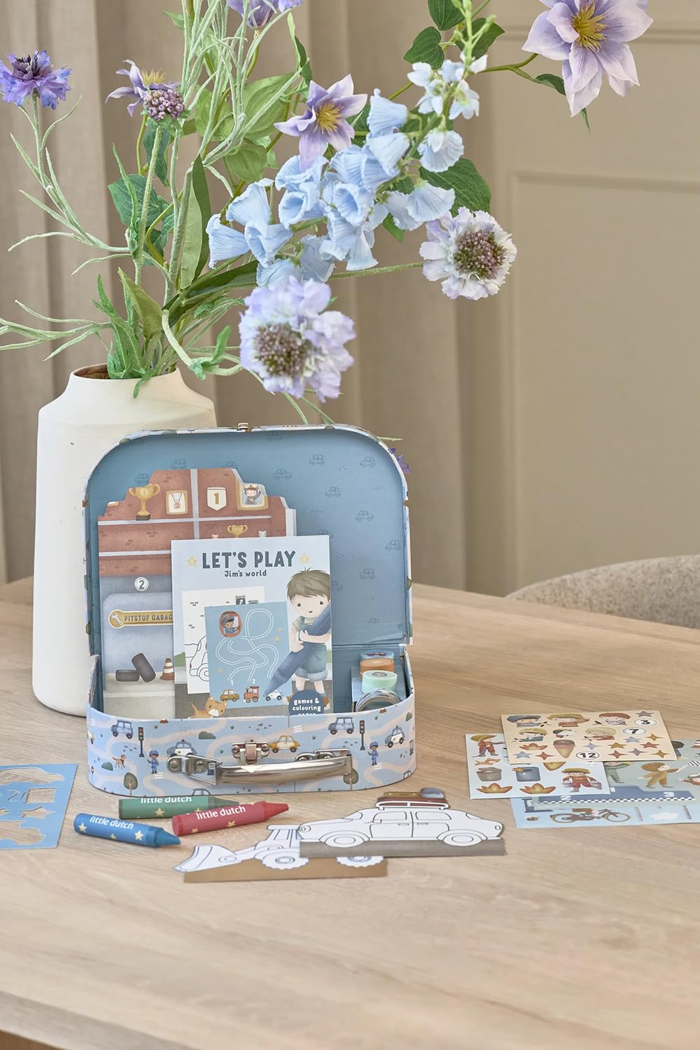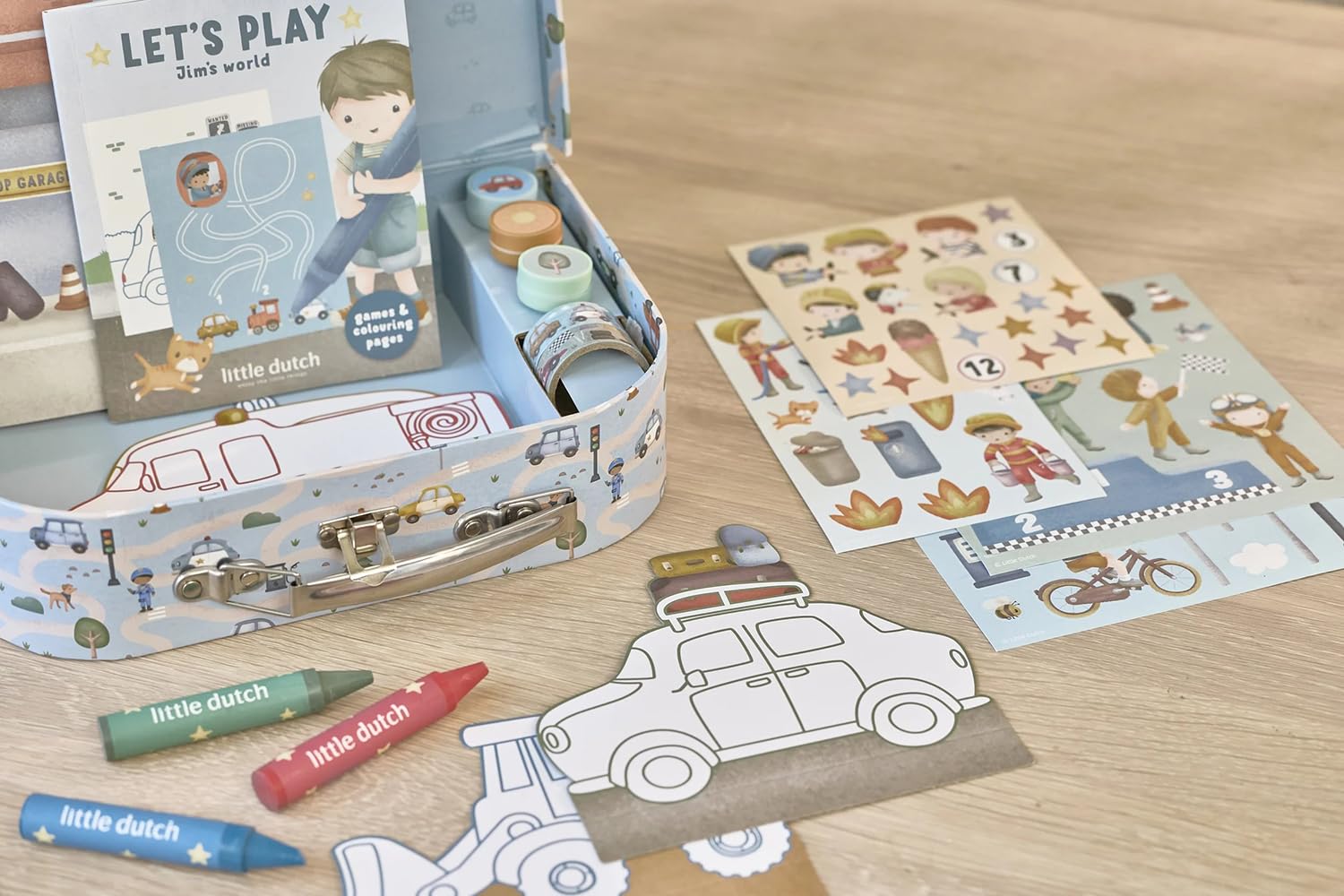 In dem stabilen, reich verzierten Koffer findest du alles, um gemeinsam zu zeichnen, zu kleben und zu stempeln: Schablonen, Sticker, Kreiden, Stempel, Malkarten und Washi-Tape.