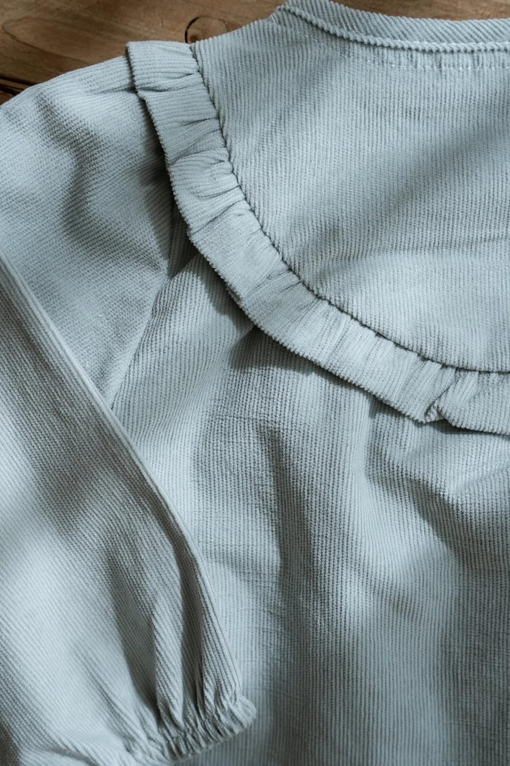 Diese wunderschöne Bluse in einem sanften Grünton ist mit niedlichen Rüschen und einem verspielten blumenförmigen Knopf versehen, zusätzlich zu den stilvollen Knöpfen in Holzoptik.
