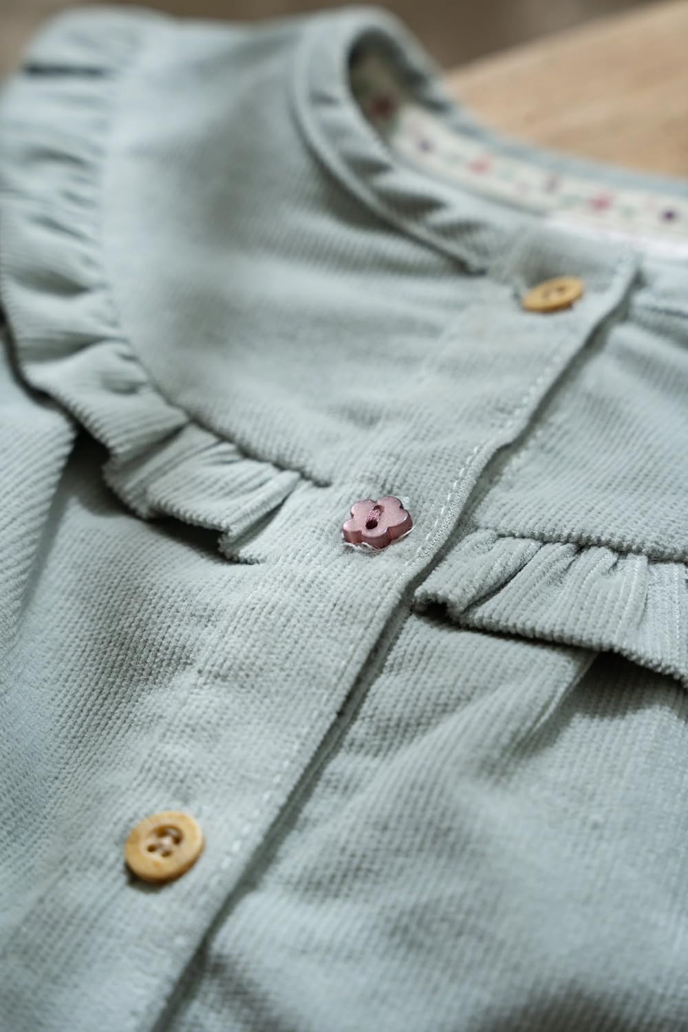 Diese wunderschöne Bluse in einem sanften Grünton ist mit niedlichen Rüschen und einem verspielten blumenförmigen Knopf versehen, zusätzlich zu den stilvollen Knöpfen in Holzoptik.