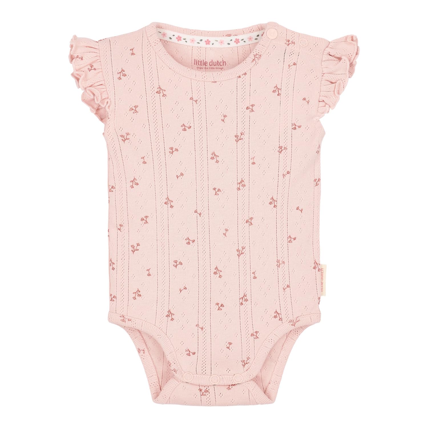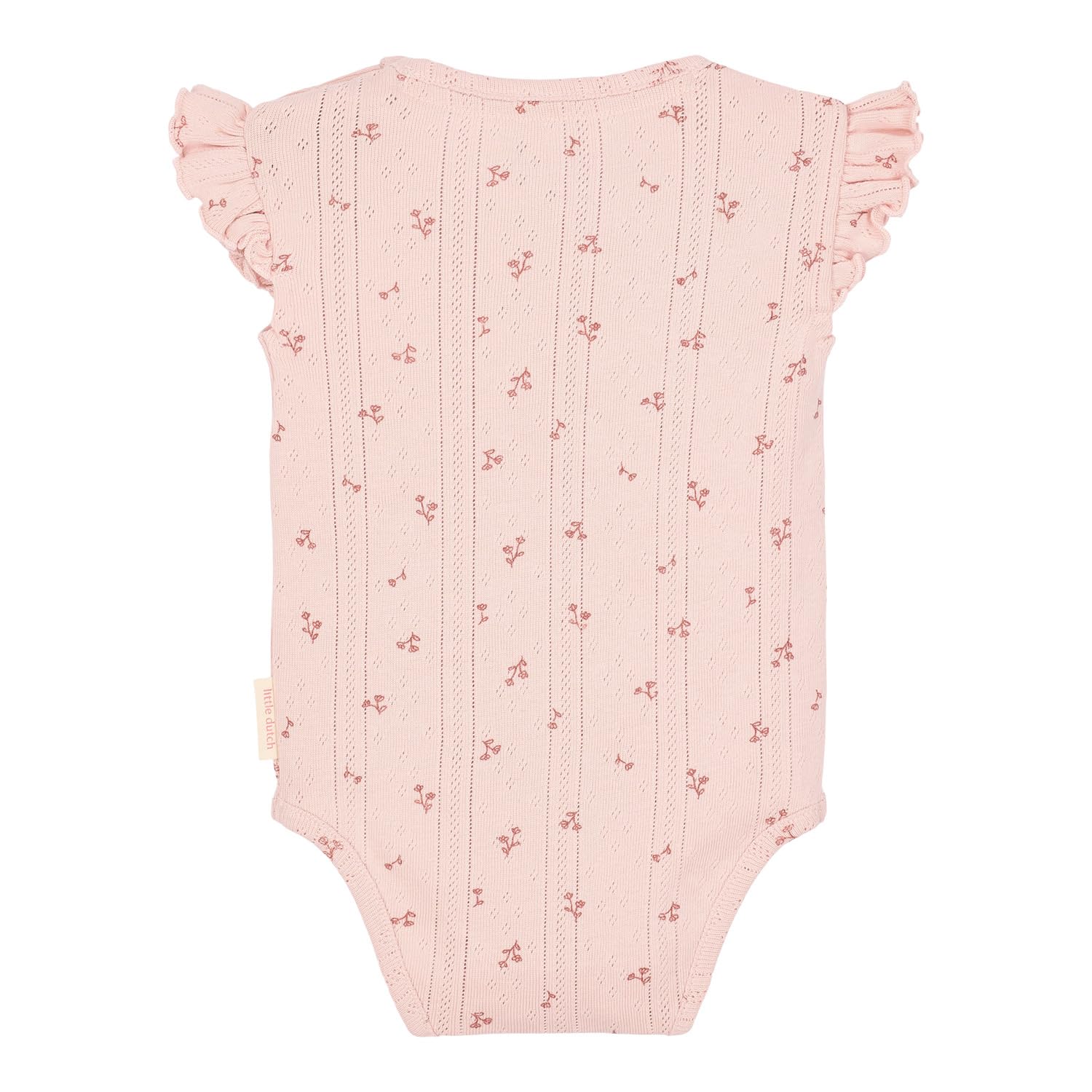 Dieser ärmellose Body in sanftem Rosa mit süßem Blumenprint und verspielten Rüschen ist ein sommerliches Must-Have für kleine Mädchen.