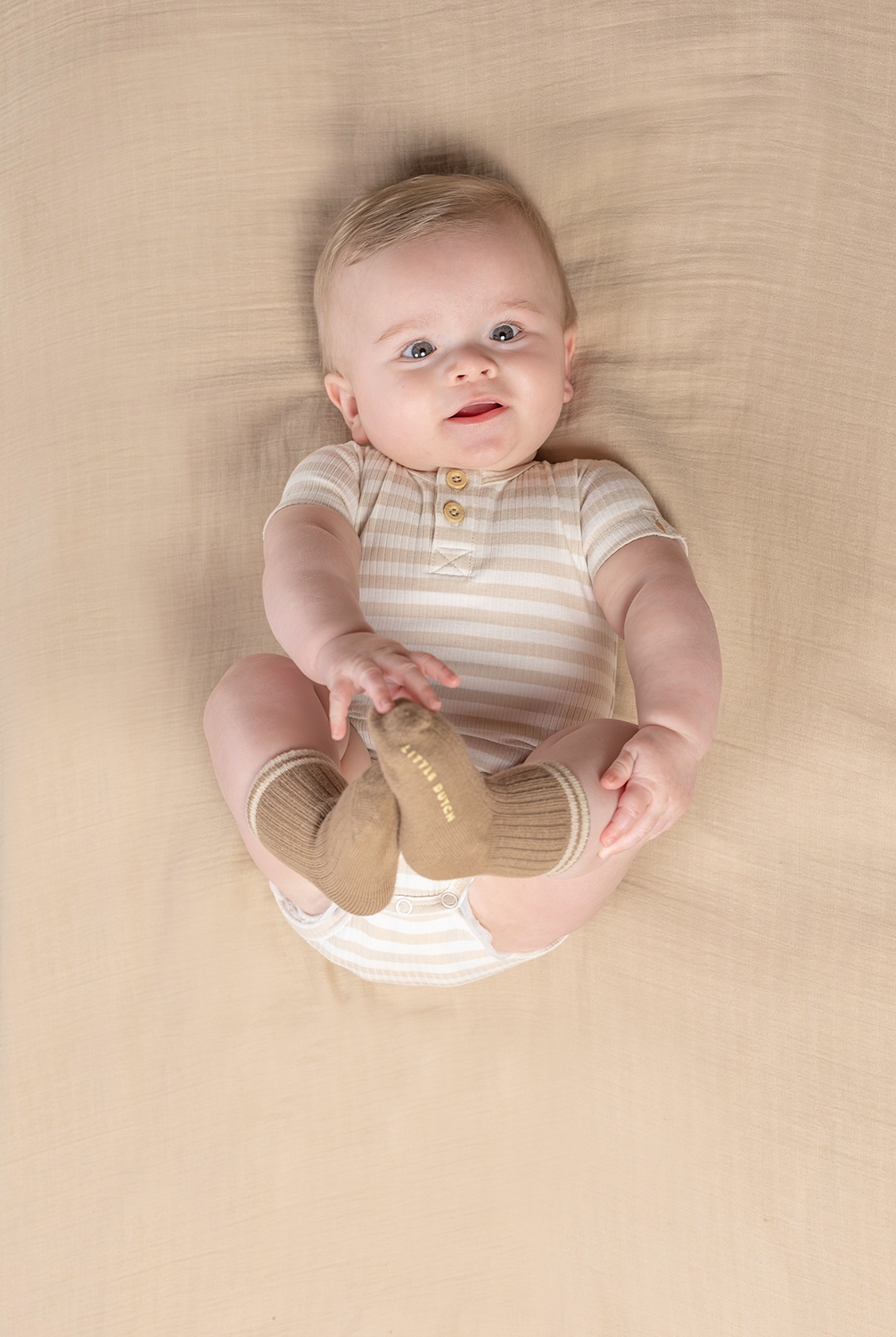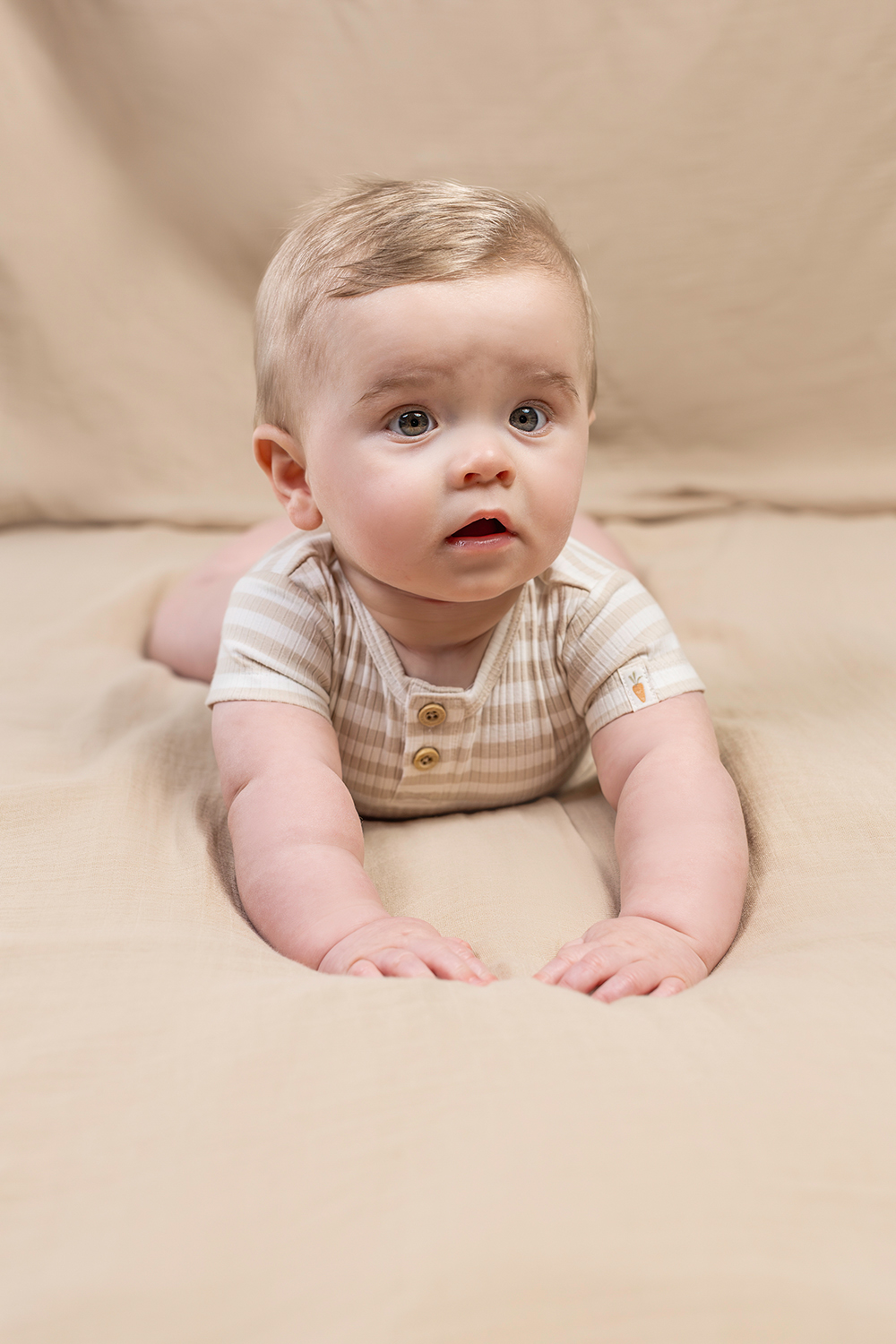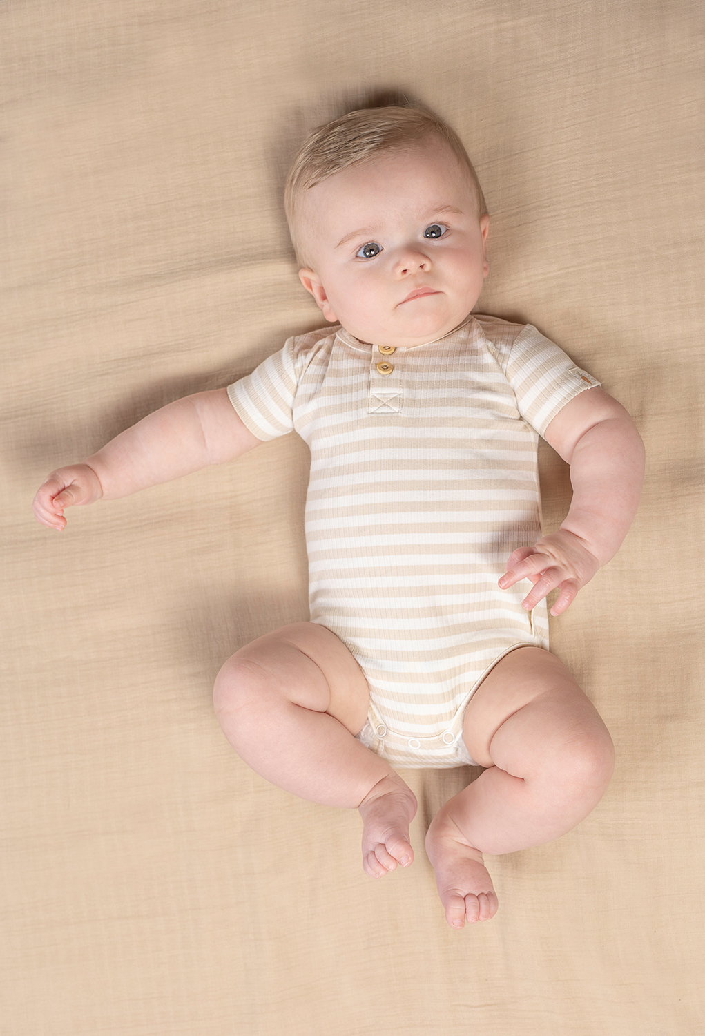 Der Body ist aus herrlich weicher Bio-Baumwolle gefertigt und sandfarben und weiß gestreift.