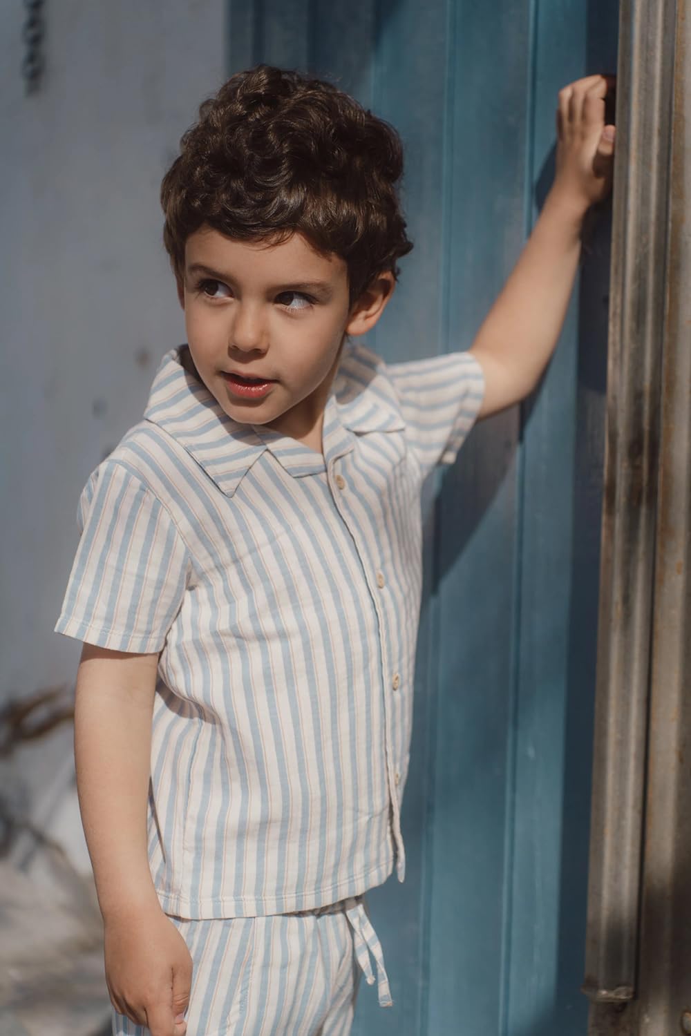 Frisch, luftig und farbenfroh. Dieses Hemd mit kurzen Ärmeln besteht aus weichem Musselinstoff und hat ein fröhliches Streifenmuster in mehreren Farben.