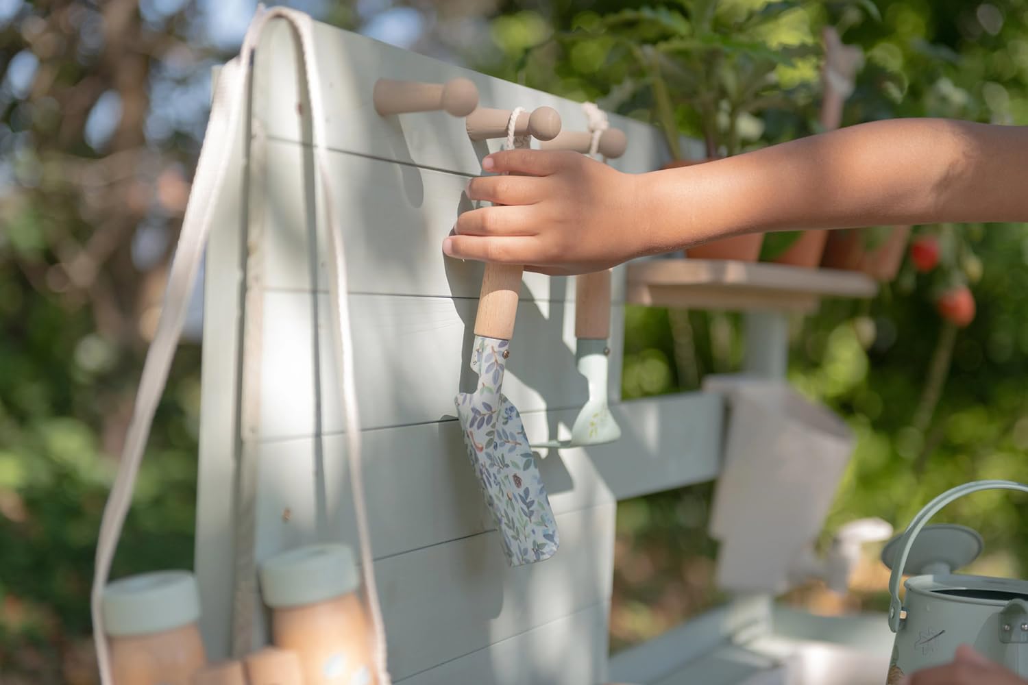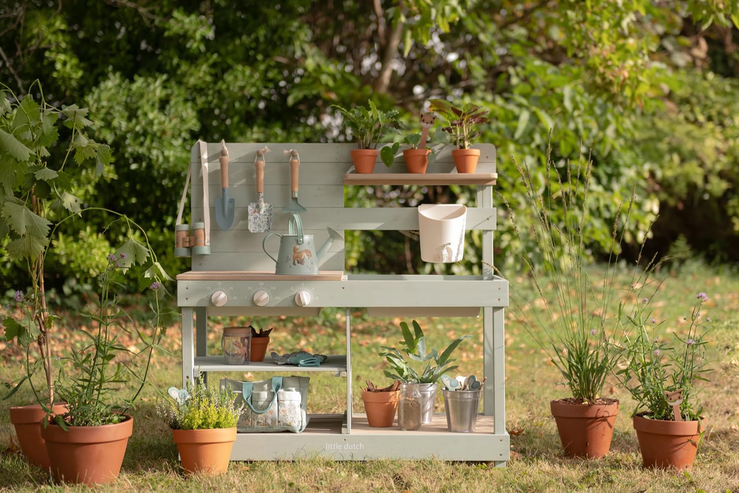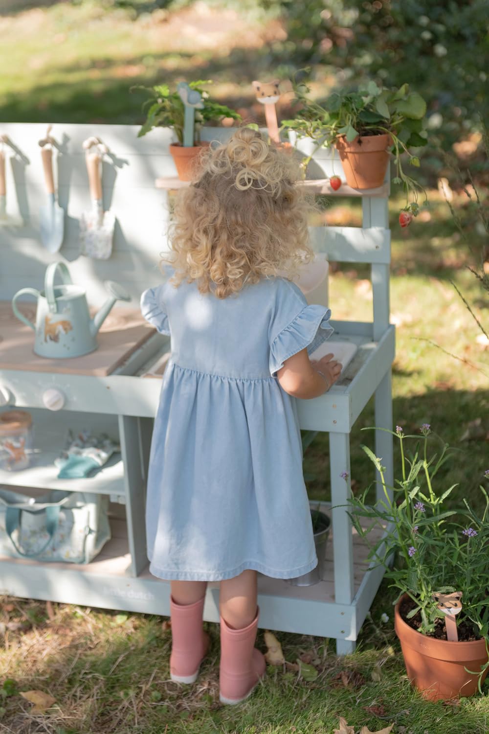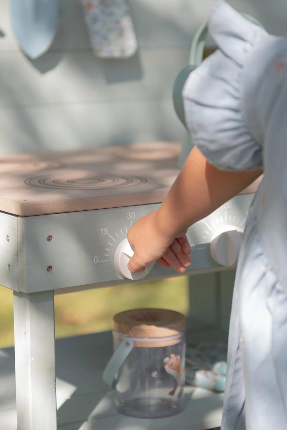 Mit drehbaren Knöpfen, zwei Waschbecken und einem echten Wasserhahn mit Reservoir lädt sie zu endlosem Rollenspiel im Freien ein.