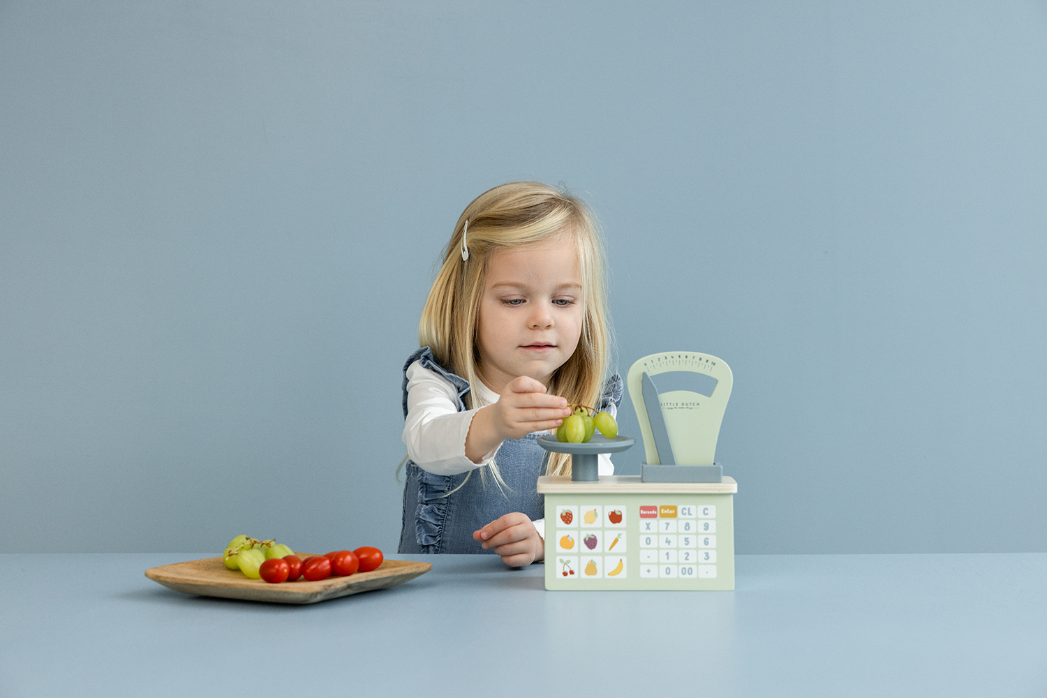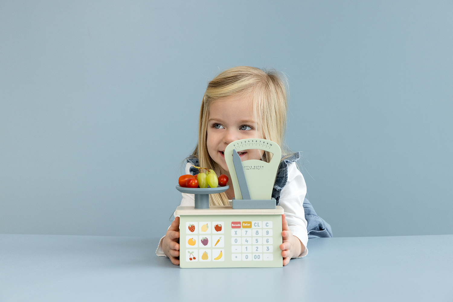 Mit dieser tollen Kaufladen-Waage bist du ein echter Gemüsehändler! Mit ihr kannst du die Produkte wiegen und den Gesamtpreis für deine Kunden berechnen.