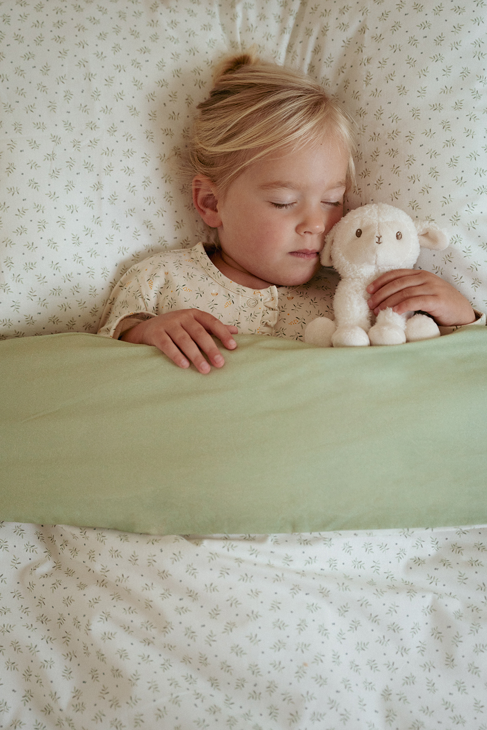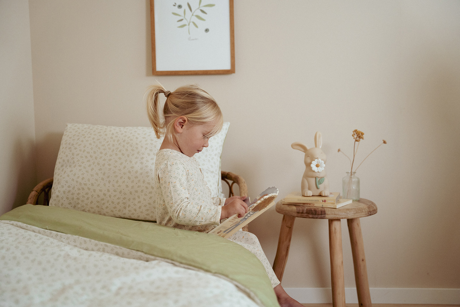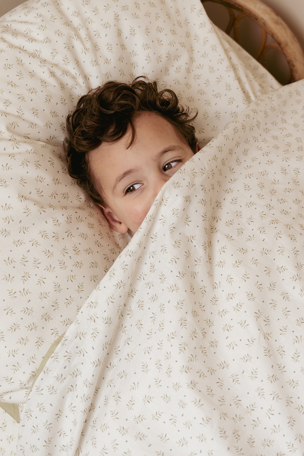 Der weiche Bettbezug besteht aus 100% Baumwolle (Bio) mit dem Blueberry Leaves-Design auf der einen Seite und der einfarbigen Farbe Sage auf der anderen Seite.