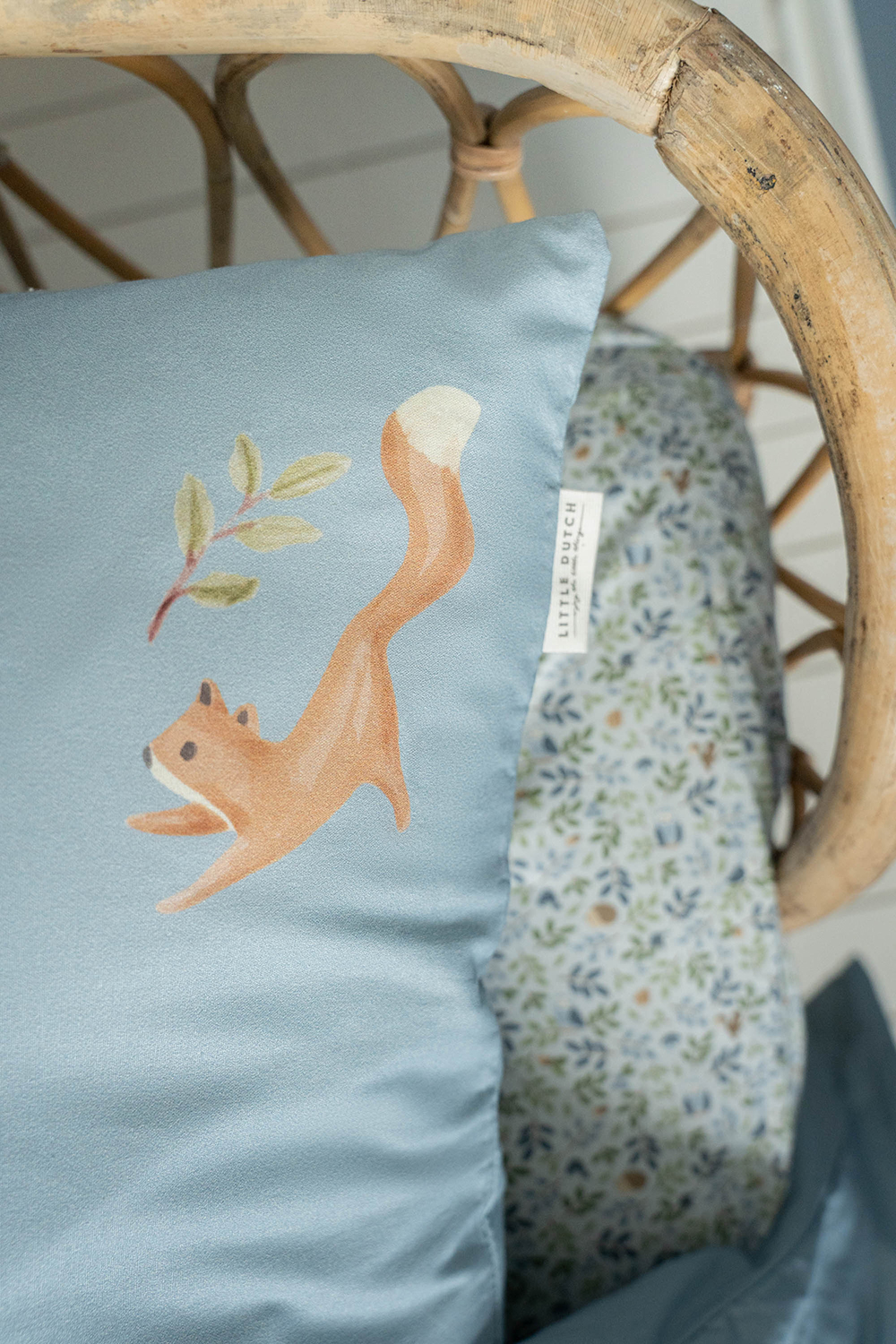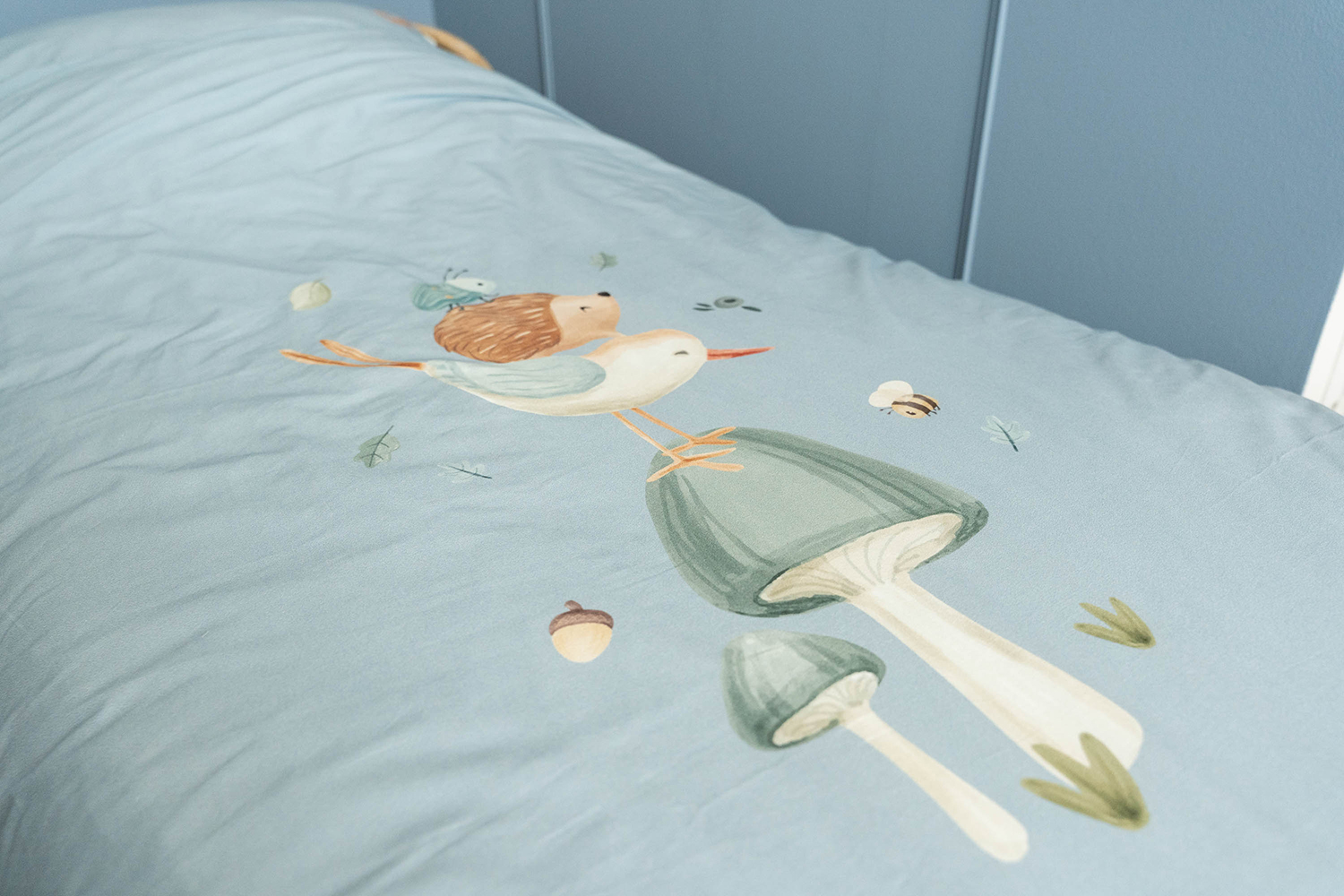Der weiche Bettbezug besteht zu 100% aus biologischem Anbau in der einfarbigen Farbe Reinblau und ist mit einer verspielten Szene aus dem Wald verziert.