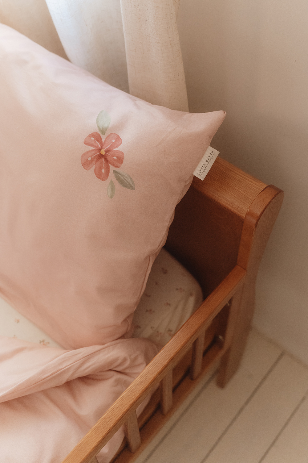 Der weiche Bettbezug ist aus 100% Baumwolle (Bio) in der schlichten Farbe Blossom gefertigt und mit einer verspielten Szene eines leuchtenden Gartens verziert.