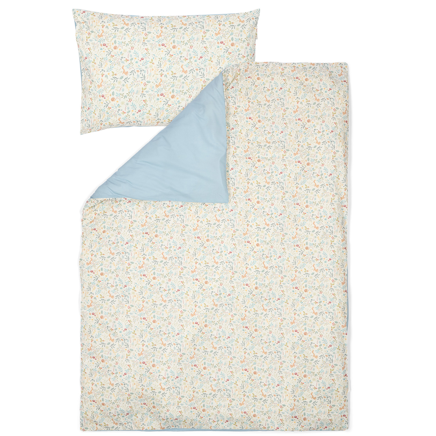 Der weiche Bettbezug besteht aus 100% Baumwolle (Bio) mit dem Forest Wonders-Design auf der einen Seite und einem einfarbigen Denim Blue-Farbton auf der anderen Seite.