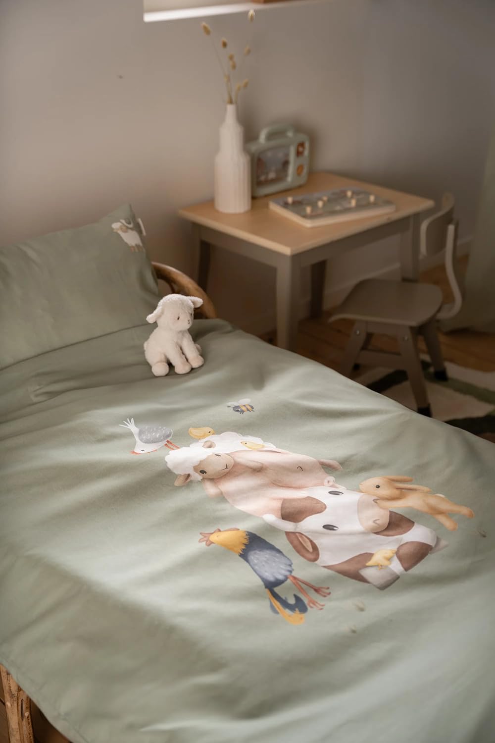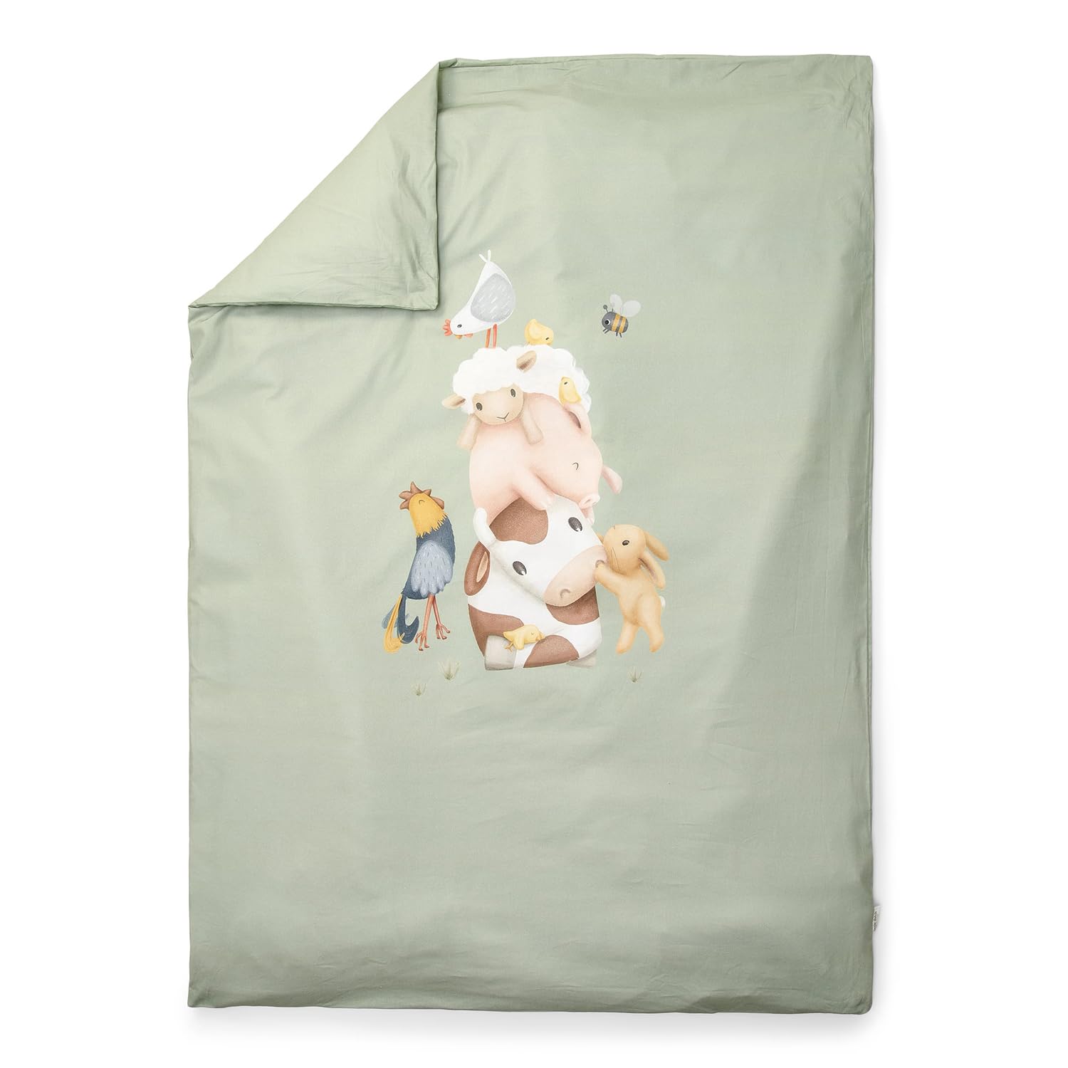 Die schlichte grüne Farbe, kombiniert mit einer süßen Bauernhofszene, sorgt für einen verspielten und beruhigenden Look.