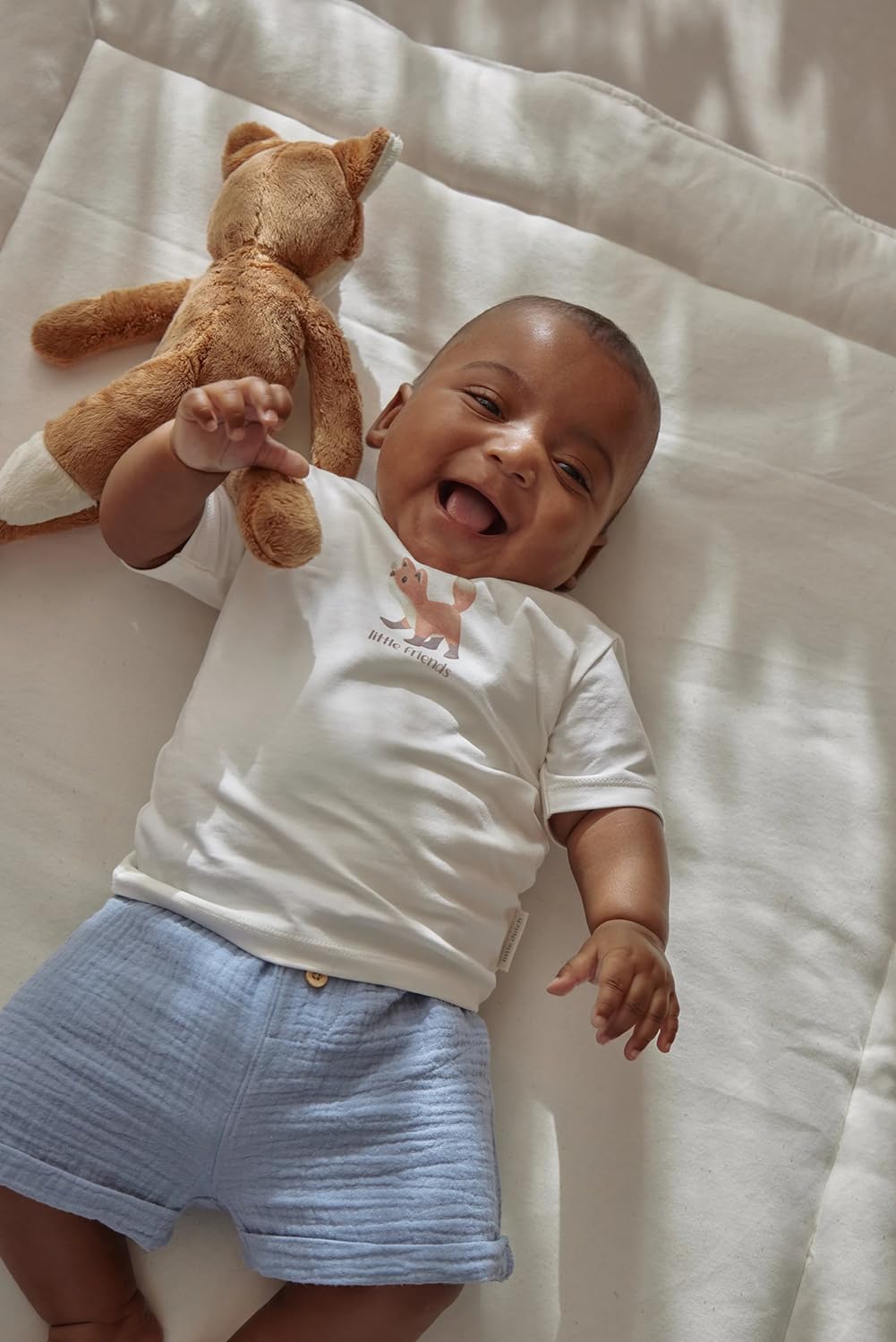 Hergestellt aus luftiger Musselin-Stoff aus Baumwolle (Bio), mit einem bequemen elastischen Bund und niedlichen Holzknöpfen.