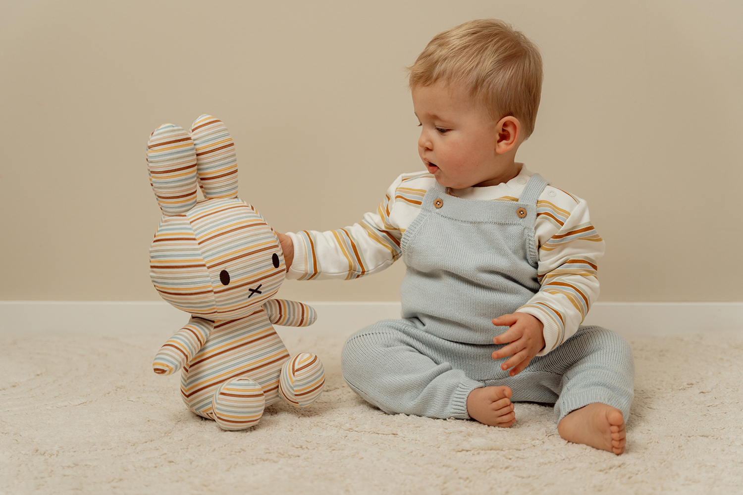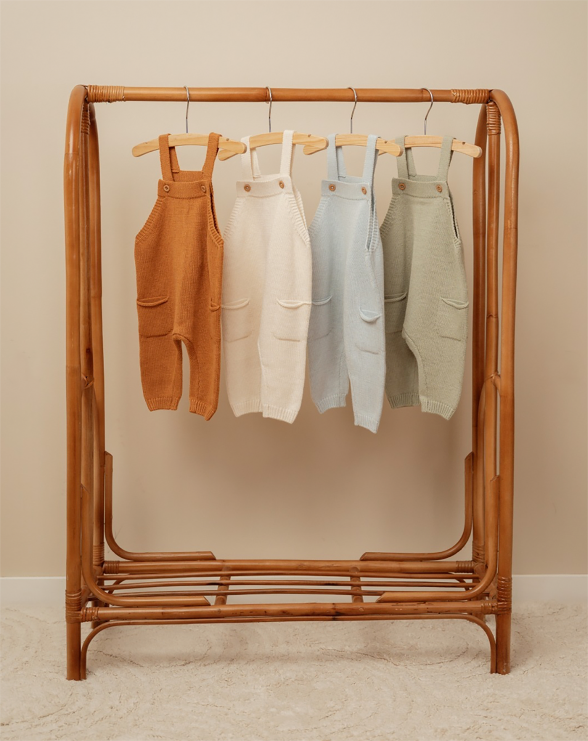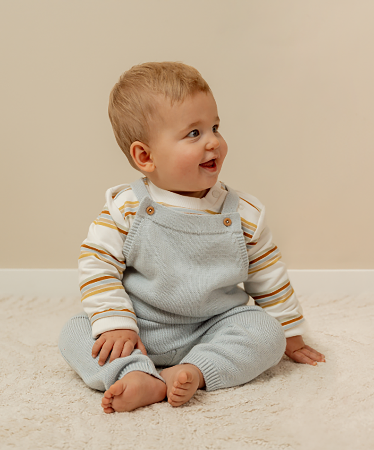 Diese gestrickte Latzhose mit Knöpfen in Holzoptik und Taschen auf der Vorderseite wird Ihrem Kind sehr gut stehen!