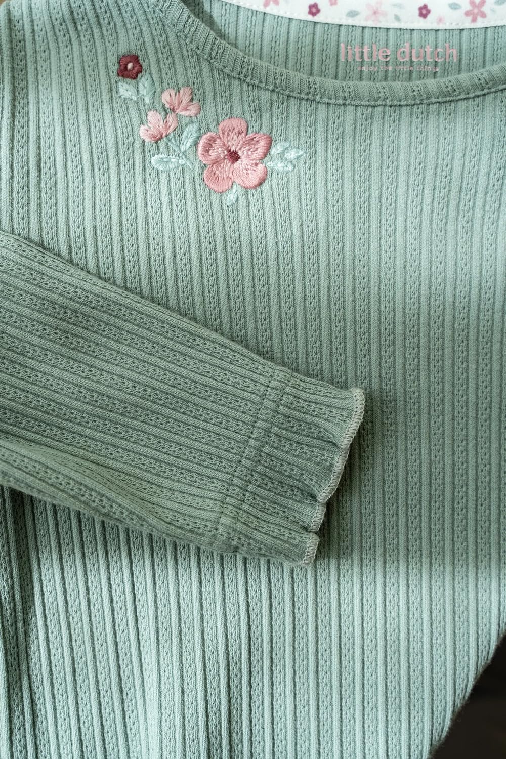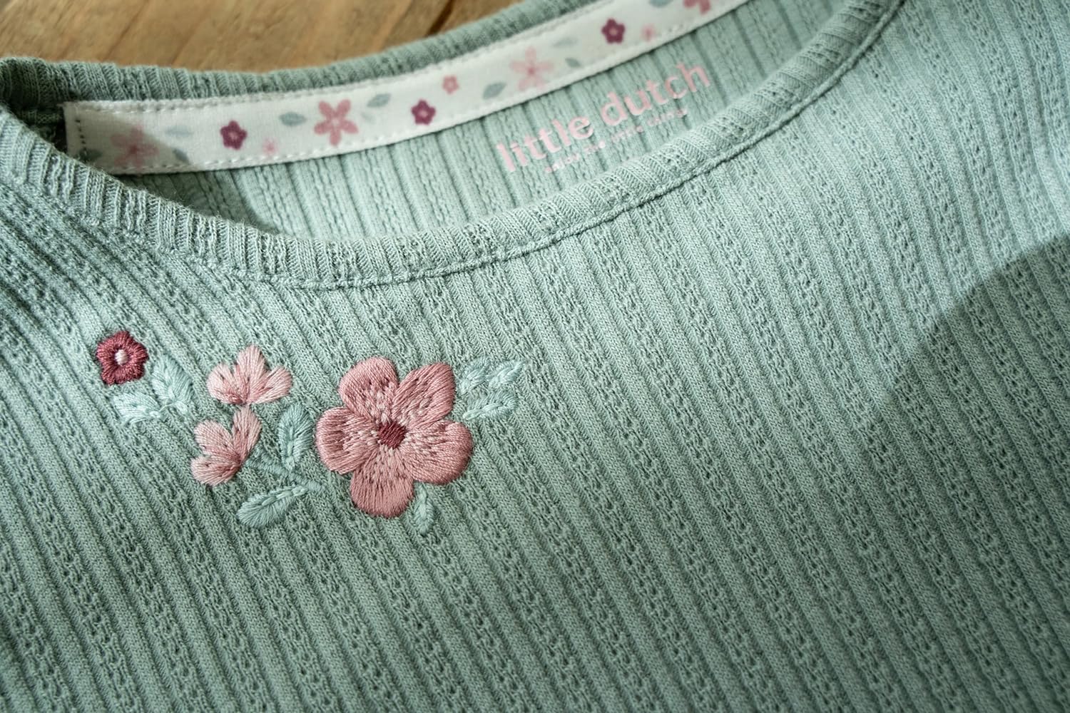 Die Kontrastnähte am unteren Rand und die niedliche Blumenstickerei verleihen dem Shirt einen verspielten Look.
