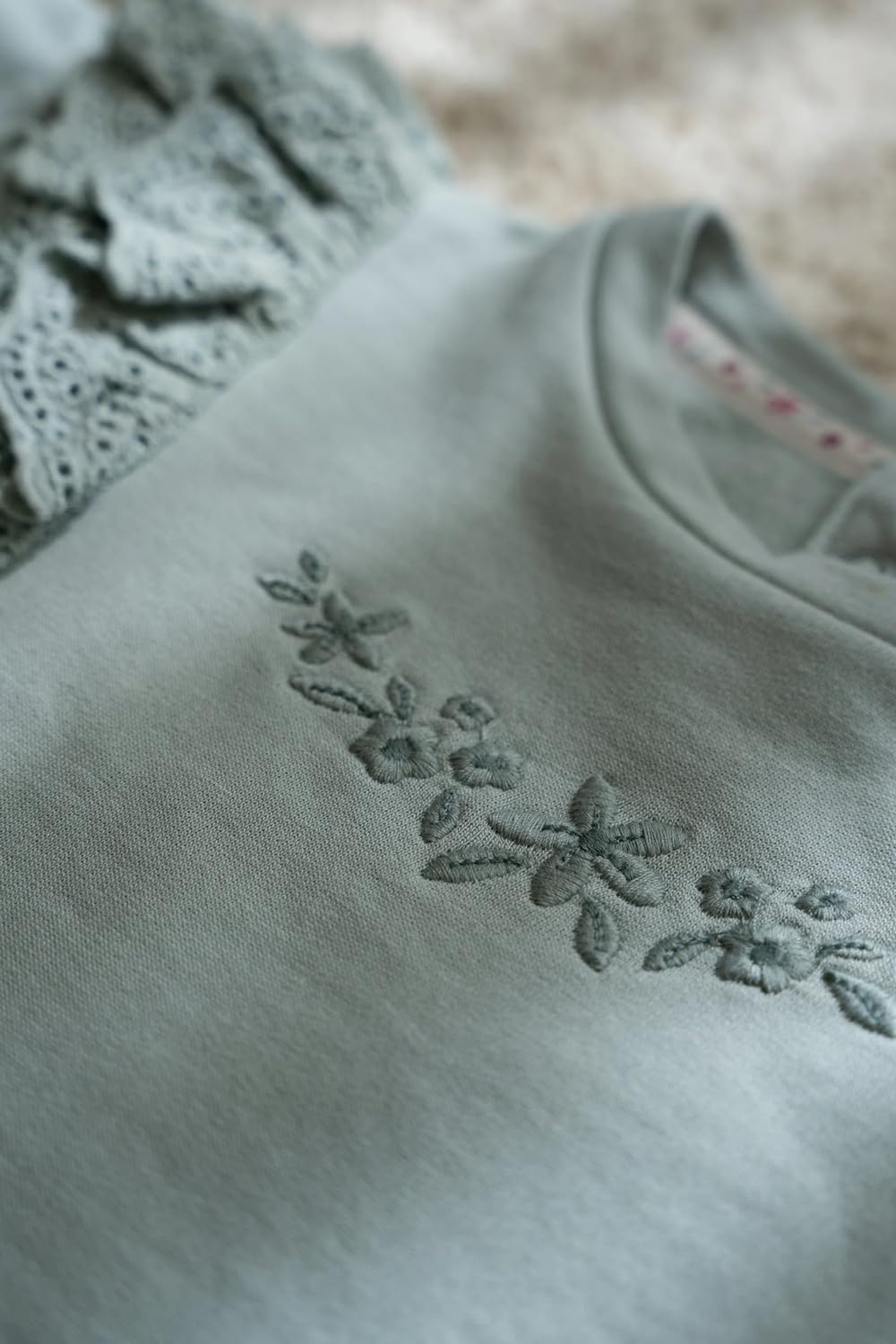 Die dezenten Rüschendetails an den Schultern und Ärmeln verleihen ihm einen verspielten und eleganten Touch, und die Blumenstickerei sorgt für einen zusätzlichen Hauch von Charme.