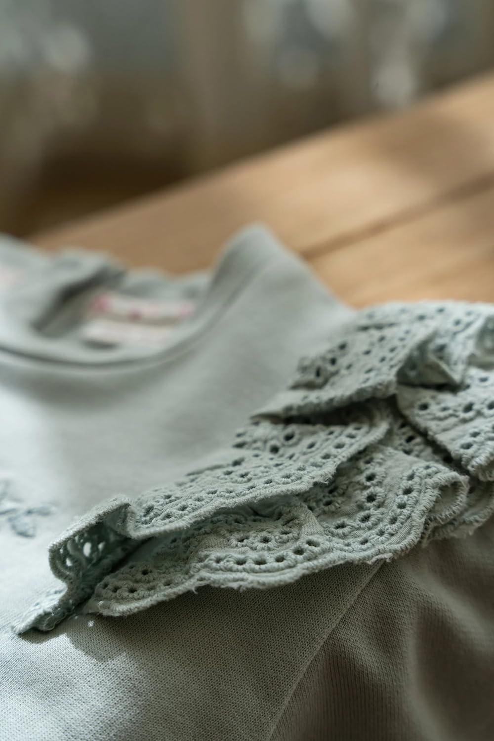 Die dezenten Rüschendetails an den Schultern und Ärmeln verleihen ihm einen verspielten und eleganten Touch, und die Blumenstickerei sorgt für einen zusätzlichen Hauch von Charme.