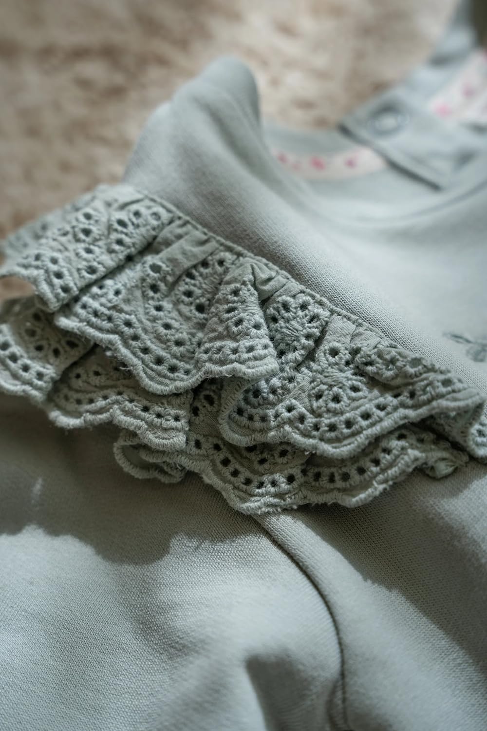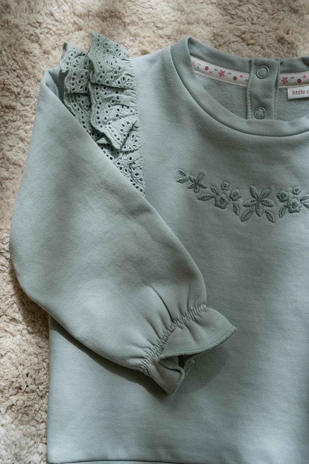 Die dezenten Rüschendetails an den Schultern und Ärmeln verleihen ihm einen verspielten und eleganten Touch, und die Blumenstickerei sorgt für einen zusätzlichen Hauch von Charme.