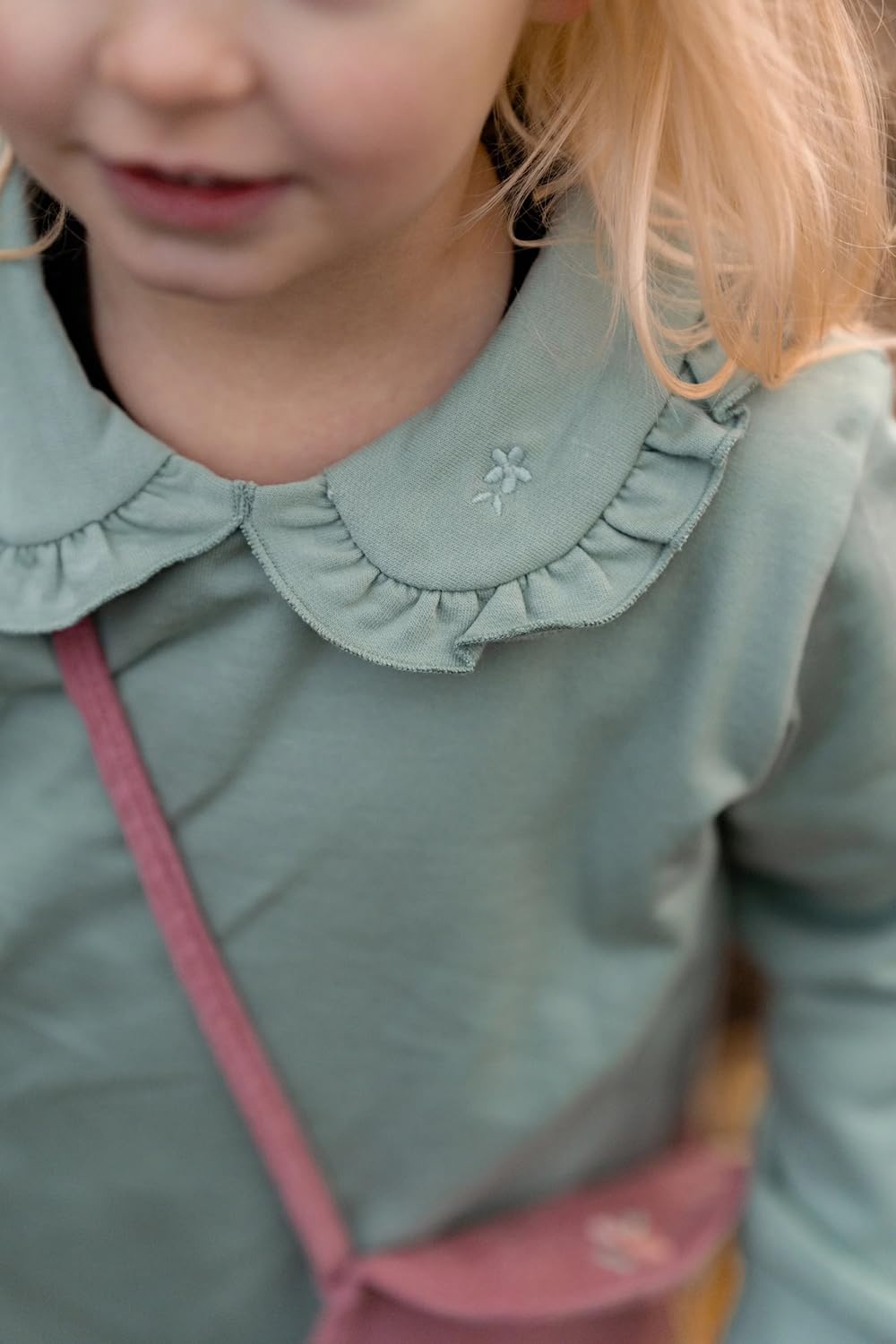 Der weiche Stoff fühlt sich angenehm an und der elegante Kragen mit der Allover-Stickerei und den verspielten Rüschen sorgt für einen Hauch von fröhlichem Flair.