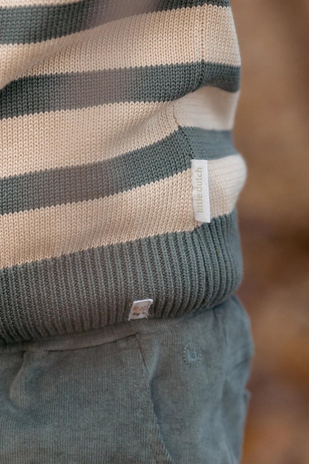 Die zweifarbigen Streifen in Balsamgrün und Creme sorgen für einen coolen Look, während die praktischen Knöpfe im Kragen das Anziehen erleichtern (für die Kleinen und die Eltern!).