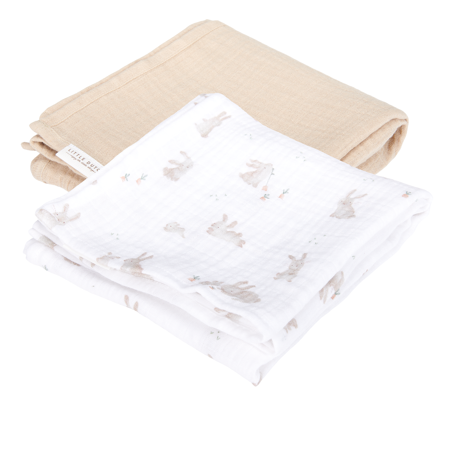 Dieses Set enthält ein hydrophiles Tuch mit dem niedlichen Hasenaufdruck der Baby Bunny Kollektion und ein unifarbenes, beiges hydrophiles Tuch.