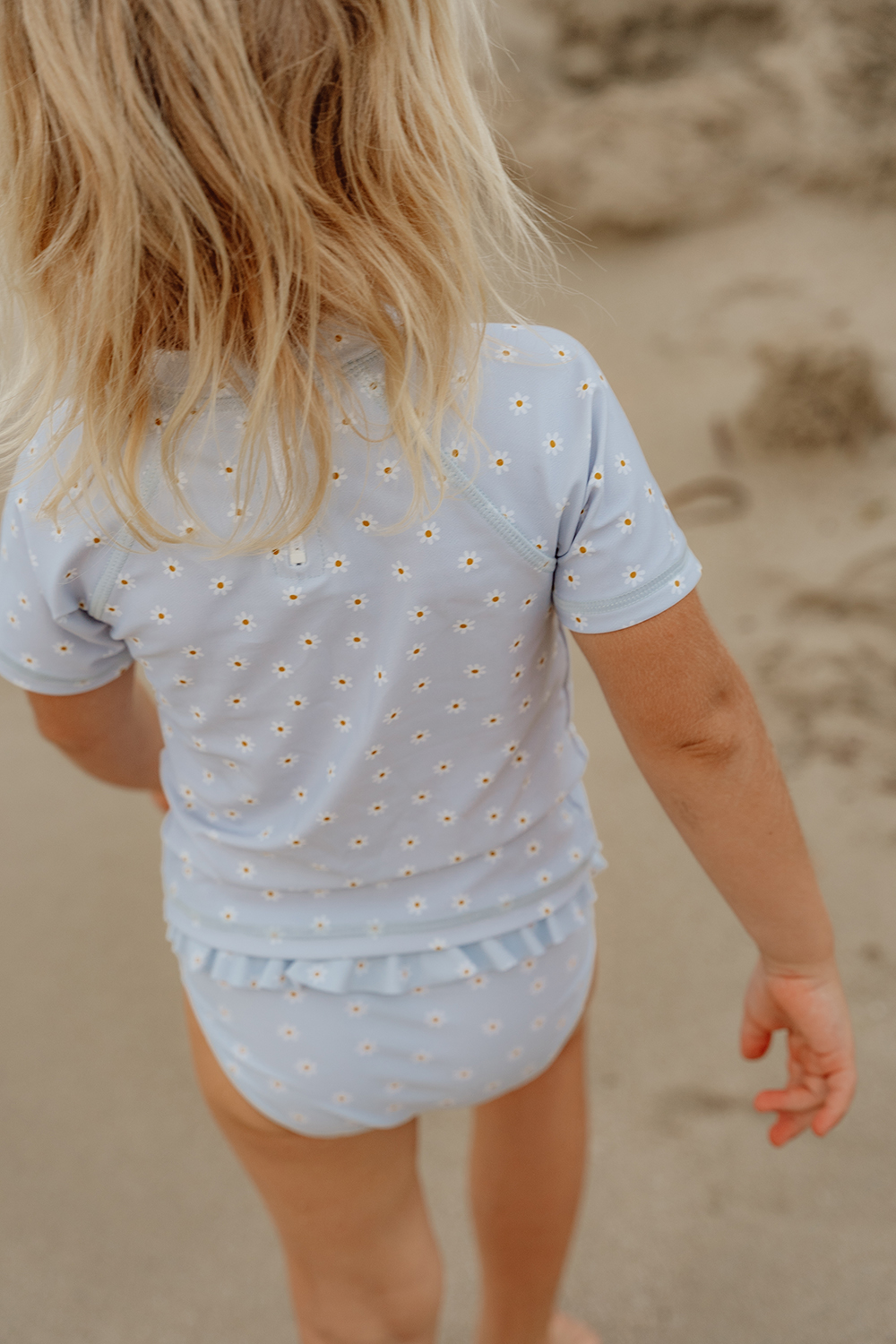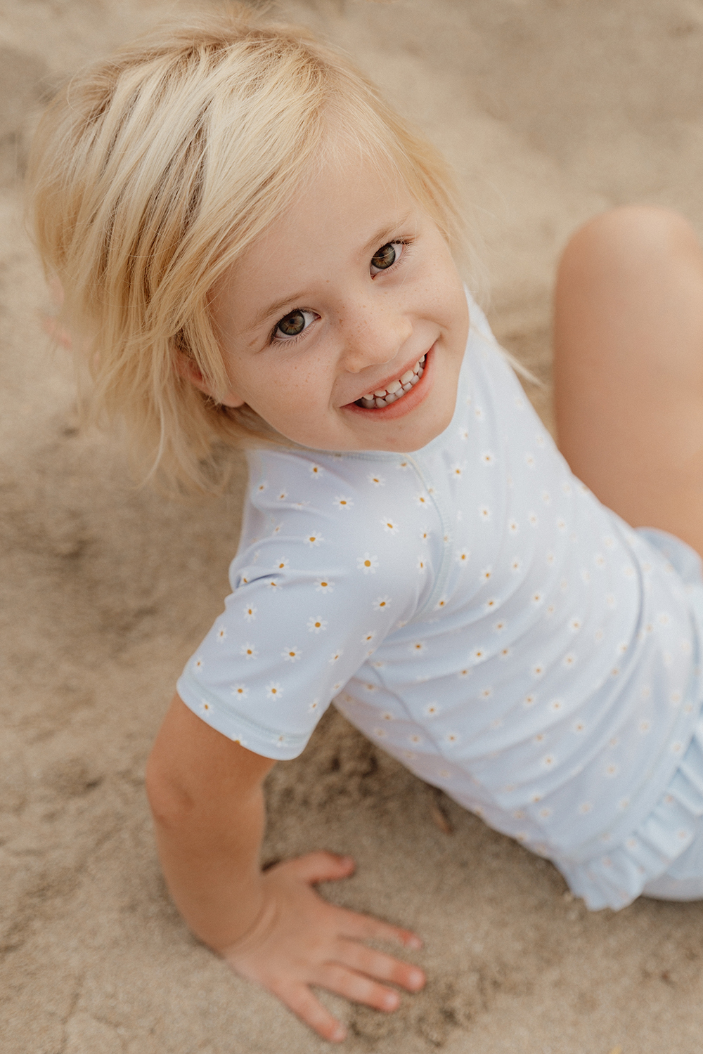 Ihr Kleines wird das süße hellblaue T-Shirt mit dem fröhlichen Gänseblümchen-Muster und dem Reißverschluss auf der Rückseite lieben.