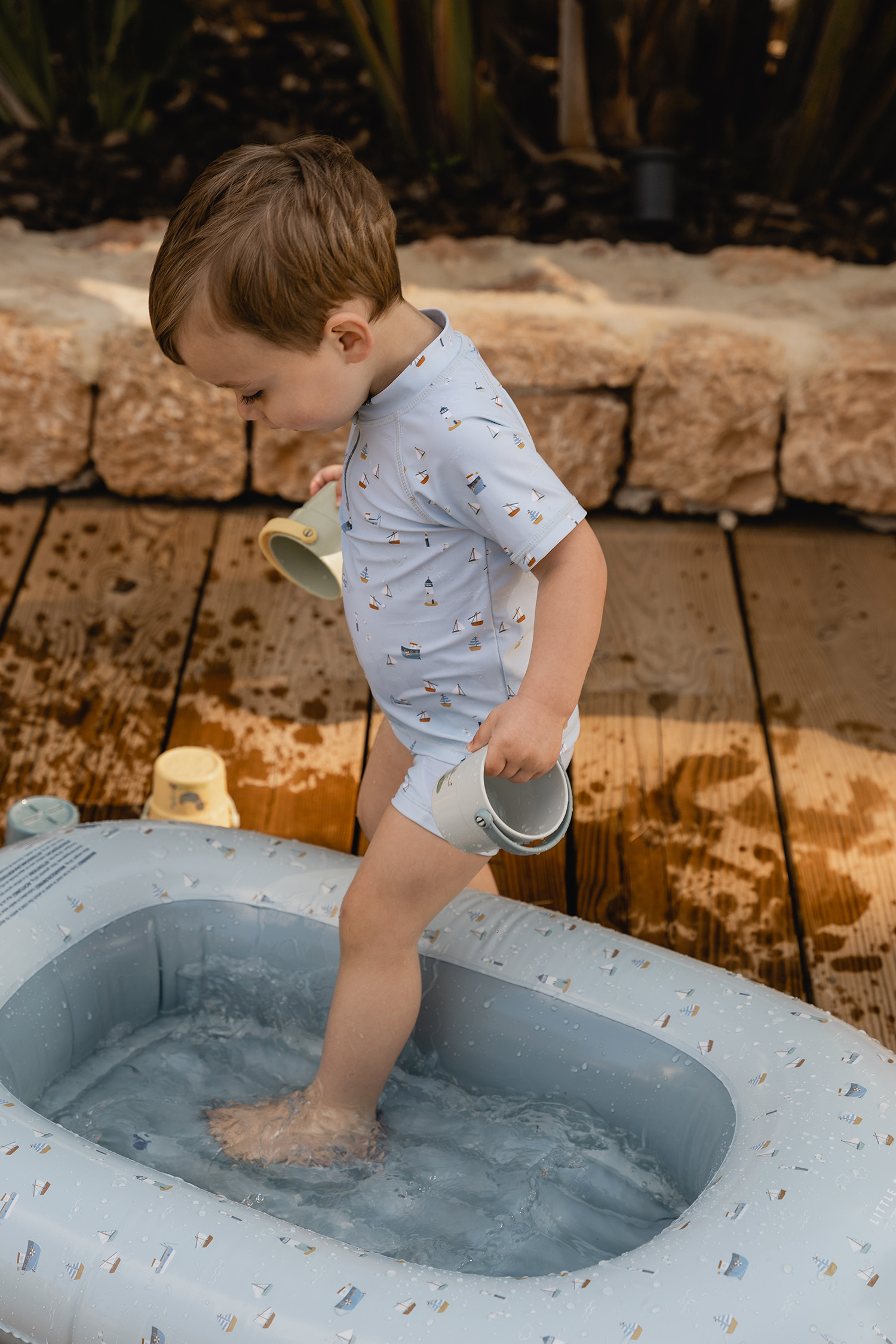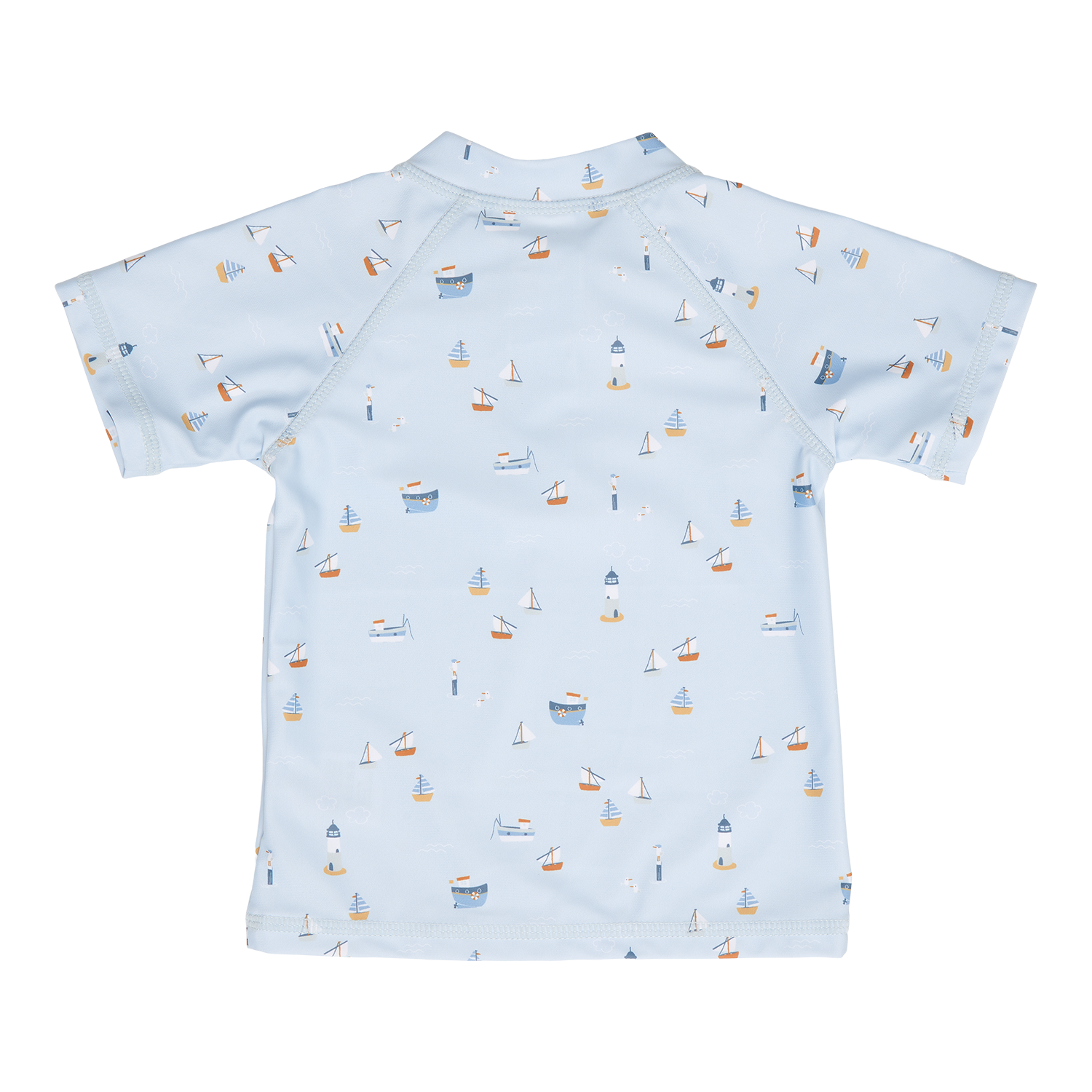 Dieses kurzärmlige Schwimmshirt ist hellblau und mit Möwen, Leuchttürmen und Segelbooten von Sailors Bay bedruckt.