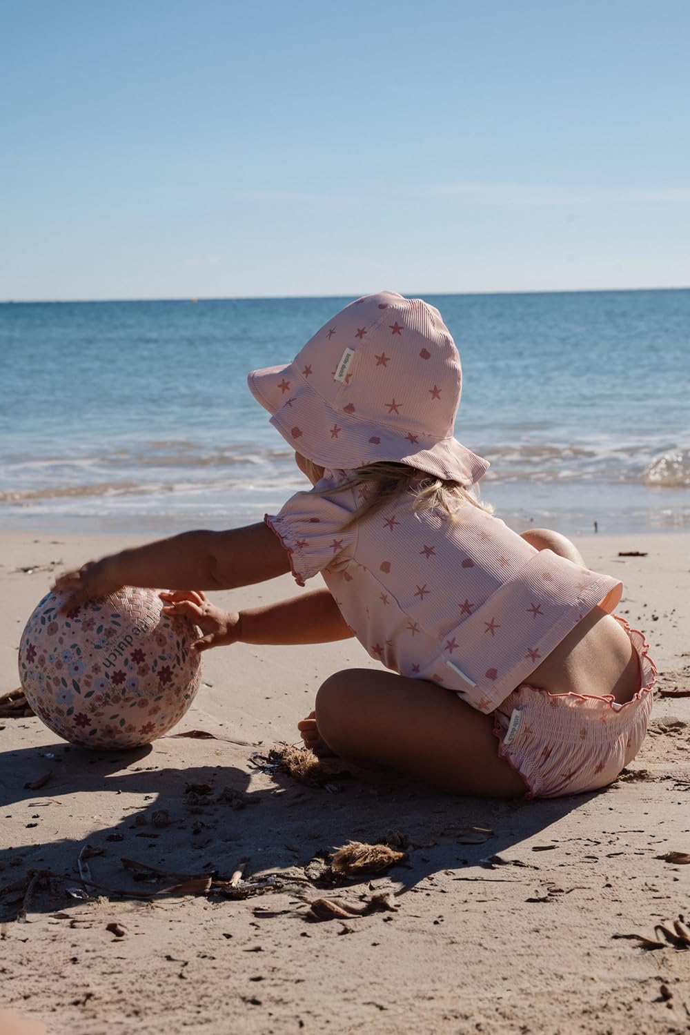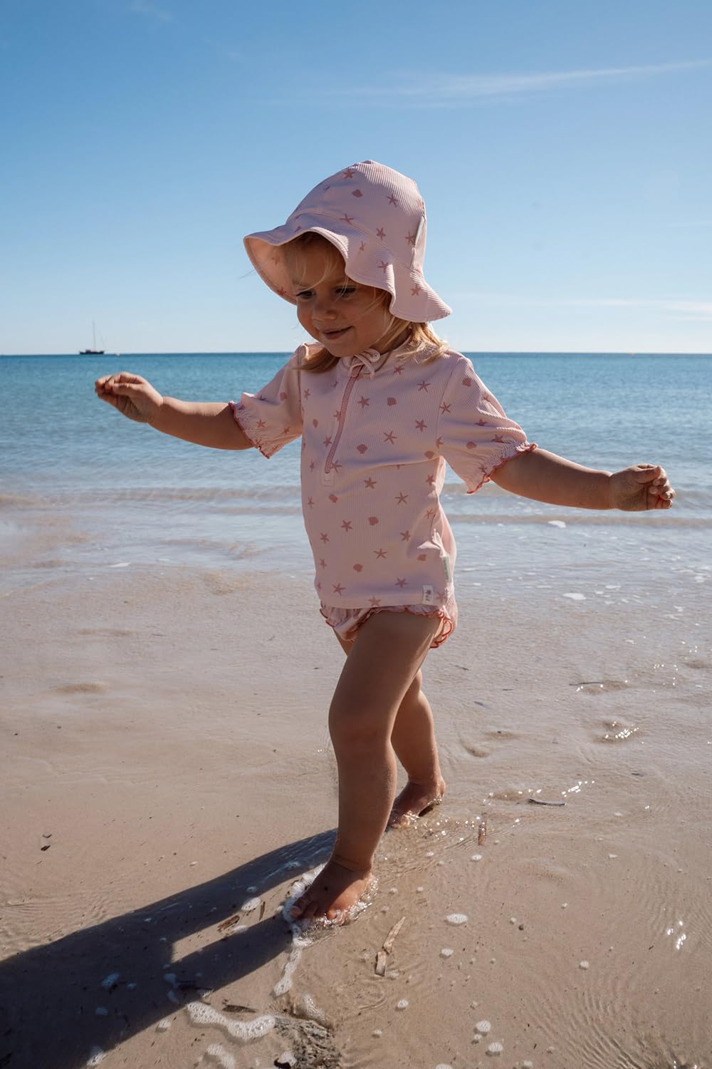 Der weiche rosa Stoff voller Muscheln und Seesterne lässt Ihr Kleines in sommerlicher Stimmung erstrahlen.
