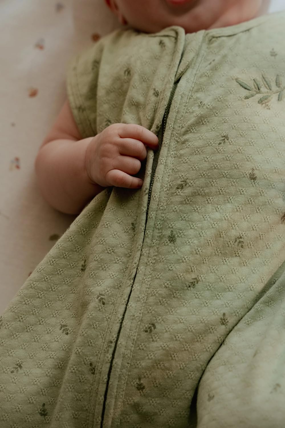 In diesem Schlafsack in der schönen Farbe Pure Sage mit dezentem Blätterdruck und einer zarten Stickerei auf der Brust schläft Ihr Kleines stilvoll und bequem.