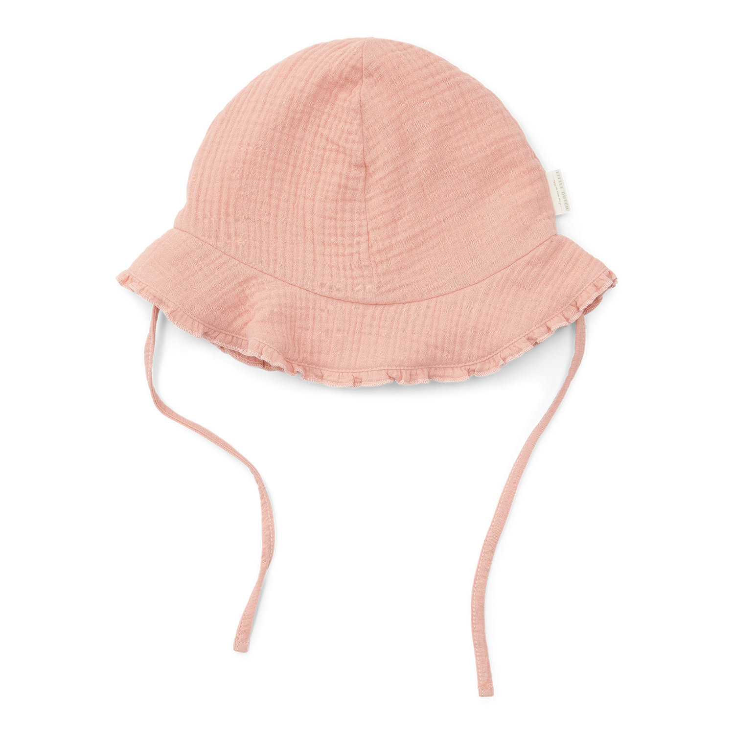Dieser weiche und luftige Musselinhut aus Bio-Baumwolle hat zwei Kordeln, um ihn auf dem Kopf Ihres Kindes zu befestigen.