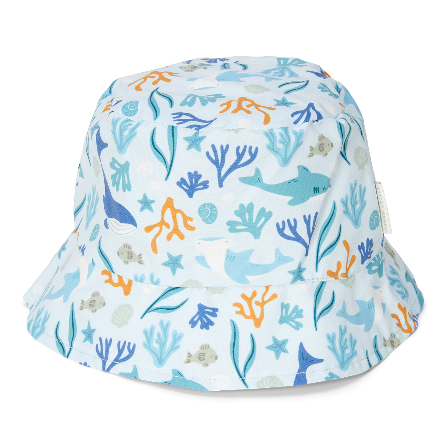 Wählen Sie Ocean Dreams, ein heiterer Allover-Print mit Meerestieren auf hellblauem Canvas. Oder drehen Sie den Hut auf links für einen lässig gestreiften Look in Weiß und Honigtönen.