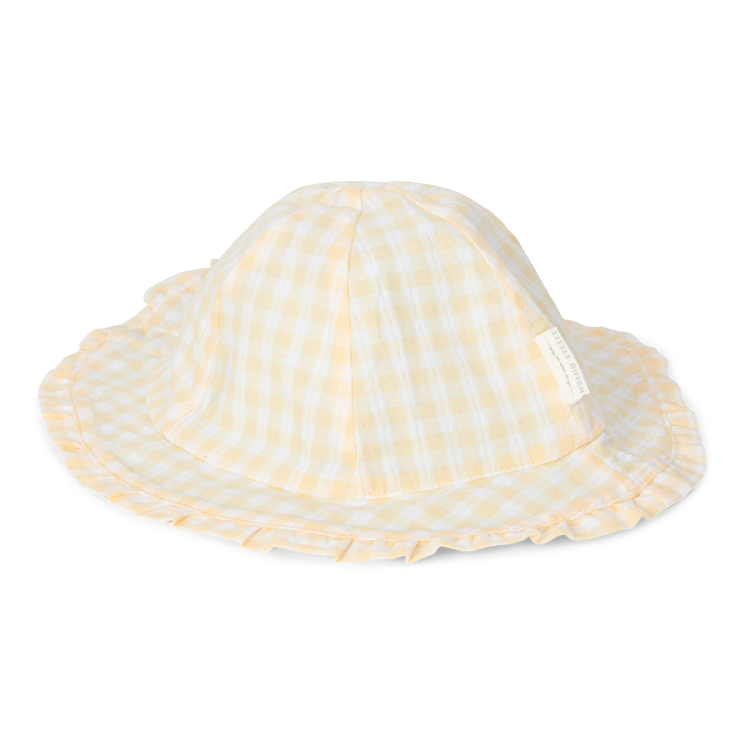 Auf der einen Seite ist der Hut mit Sunshine Checks verziert, einem reizvollen Muster, das gelbe und weiße Karos kombiniert.