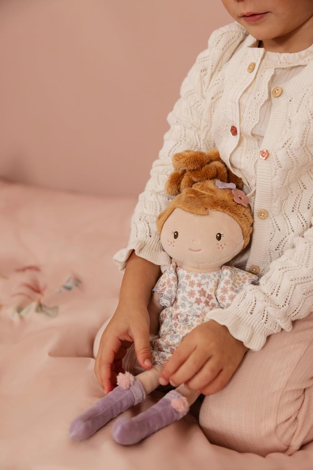 Lerne Kuschelpuppe Ava kennen, eine weiche Freundin mit welligem Haar und einem fröhlichen Blumenkleid.