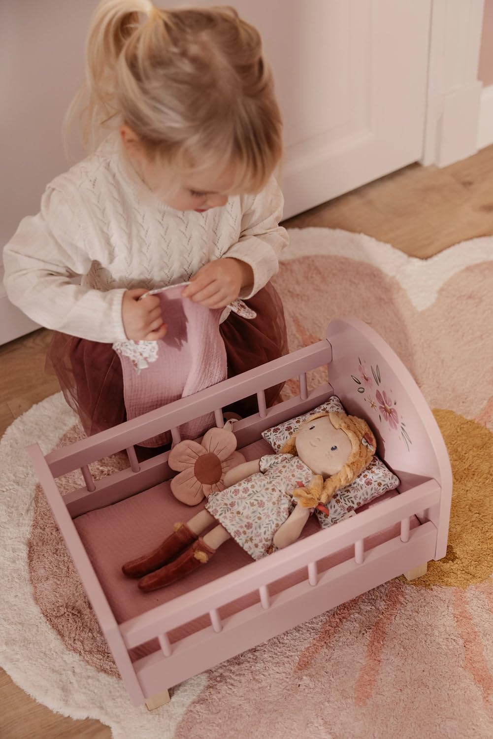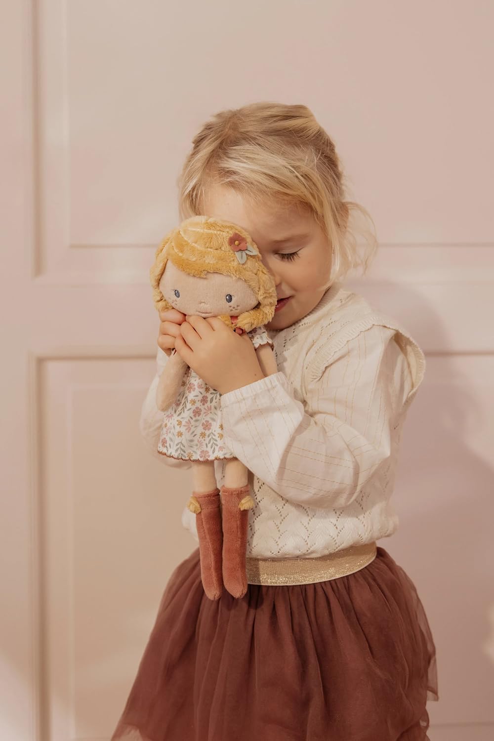 Ihr weiches Blumenkleid und die Stiefelchen mit Bommel laden zu endlosen Kuschelstunden und gemeinsamen Spielen ein.