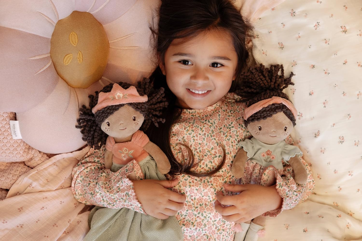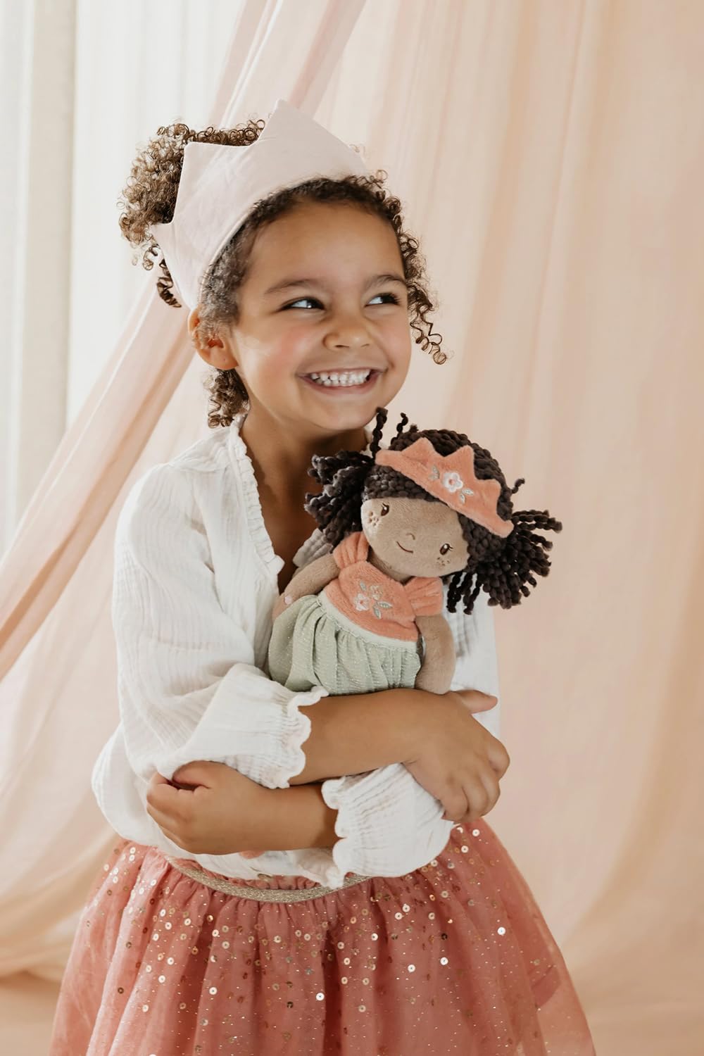 Lerne Prinzessin Evi kennen, eine weiche Kuschelpuppe mit wunderschönem dunklem, lockigem Haar und einem eleganten Kleid mit Blumenstickerei.